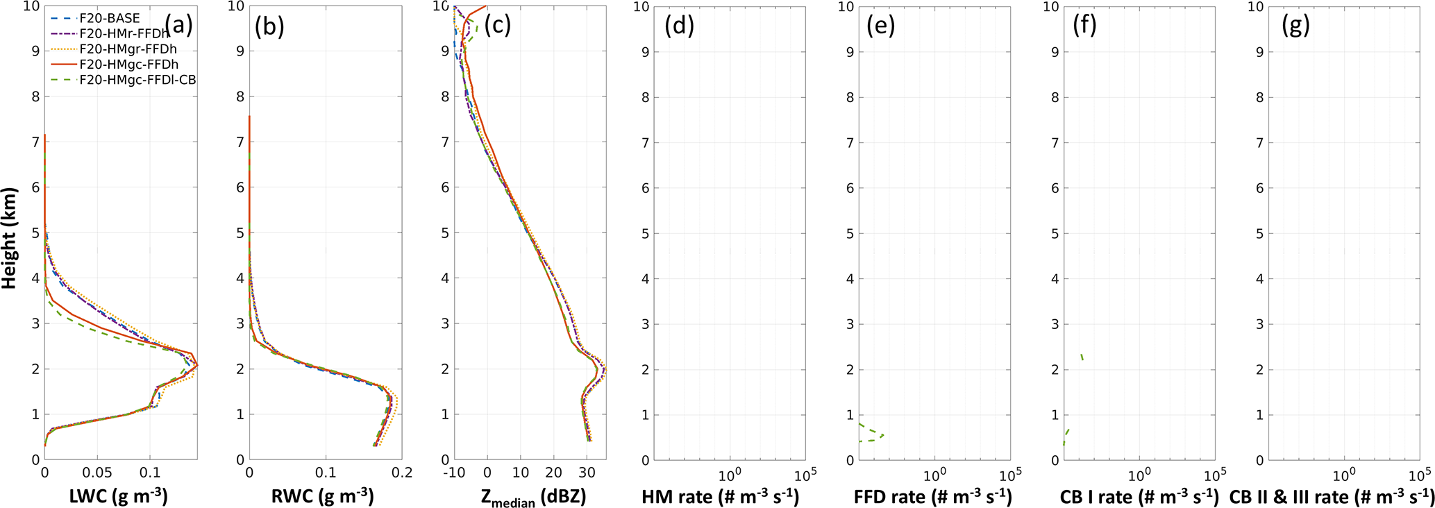 The simulated profiles within 10 km of the aircraft track indicate that the impact of SIP (across all four SIP simulations) on IWC and Ni is minimal (Fig. 15a, c). The F20-HMgc-FFDh and F9-HMgc-FFDl-CB simulations show the maximum IWC increases of approximately 10 % at altitudes of 3 and 3.7 km, respectively, compared to the F20-BASE simulation. The increase in Ni is about 2–3 times, which is significantly smaller than the Flight 9 case, where increases reached 2–3 orders of magnitude. Additionally, both F20-HMgc-FFDh and F9-HMgc-FFDl-CB generate lower LWC and RWC above 2.5 km (Fig. 16a, b). Due to the higher Ni, the values of Zmedian in both F20-HMgc-FFDh and F9-HMgc-FFDl-CB simulations are about 3 dBZ lower than in the F20-BASE simulation between 2 and 4 km altitude. No SIP activity is detected in any of the simulations at 14:30 UTC (Figs. 16d to 15g) within 10 km of distance to the flight track, except for F9-HMgc-FFDl-CB, which exhibits very low rates of both FFD and CB type I. Note that there are regions with SIP activities at this time step, but they are away from the selected regions for statistics. The simulated case on 23 February 2019 appears more stratiform, with maximum vertical updraft velocities typically below 4 m s−1. This condition likely contributes to the less frequent occurrence of mixed-phase conditions near the bright band, whereas precipitation size drops driven by updrafts through the melting layer could play a crucial role in enhancing SIP activity, as suggested by Korolev et al. (2024).