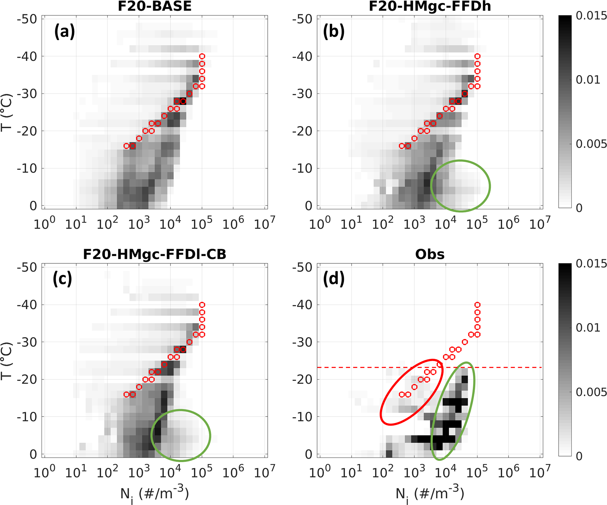 Figure 82D histograms for the frequency of Ni regarding the T for F9-BASE (a), F9-HMgc-FFDh (b), F9-HMgc-FFDl-CB (c), and the observation for Flight 9 between 20:10 and 20:50 UTC (d). Small red cycles: parameterized Ni due to condensation freezing/deposition ice nucleation (adapted from Cooper, 1986). Red dashed line: minimal flight T between 20:10 and 20:50 UTC.