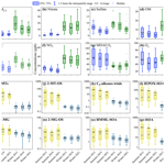 Figure 5 shows the γ and khet values for IEPOX and HMML&MAE estimated using different sets of kinetic parameters listed in Table 1. The CMAQ-modeled values are also displayed for comparison. The khet estimated by , and in summer had highest values in 2019. This might be attributed to the fact that these three sets of parameters lack the third-order reaction rate constant of IEPOX with nucleophiles catalyzed by bisulfate (Table 1). As a comparison, we calculated the khet of IEPOX and HMML&MAE excluding the reaction rate constant catalyzed by bisulfate using and (Fig. S10). We found that the inter-annual trend of IEPOX (Figure S10a) and HMML&MAE (Fig. S10b) in summer was altered and similar to that of IEPOX calculated by , and , while the inter-annual trend of khet in winter was not sensitive to the exclusion of reaction rate constant catalyzed by bisulfate. This result indicates a contribution of nucleophilic-addition of epoxides catalyzed by bisulfate to the heterogeneous reactivity. It also suggests that the is more appropriate for predicting aerosol heterogeneous reactivity toward IEPOX than other four sets of kinetic parameters.