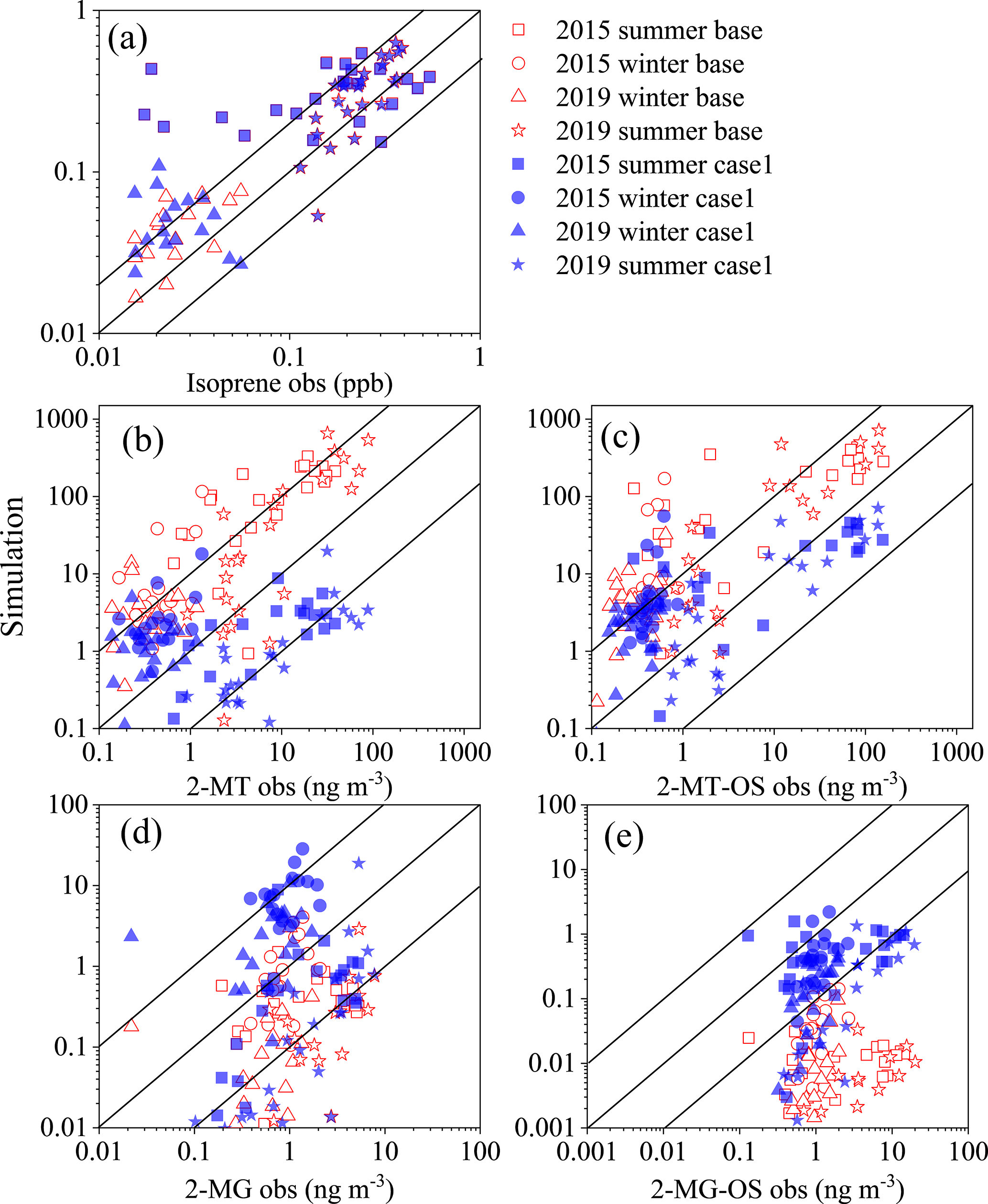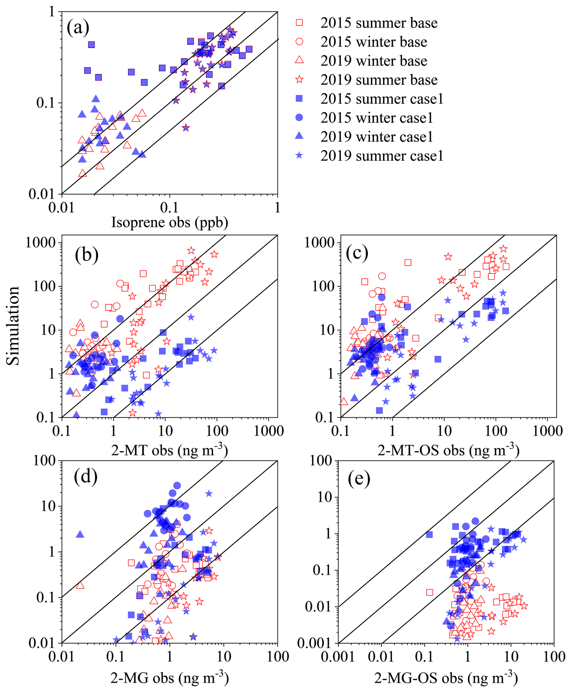 Figure 3Comparisons of simulations against observations for (a) isoprene, (b) 2-MTs, (c) 2-MT-OS, (d) 2-MG, (e) 2-MG-OS in summer and winter of 2015 and 2019. Red dot represents simulations with standard CMAQ v5.2 (Base Case), and blue represents simulations using the optimized model (Case 1). The 1:1, 10:1, and 1:10 lines are shown with solid lines.