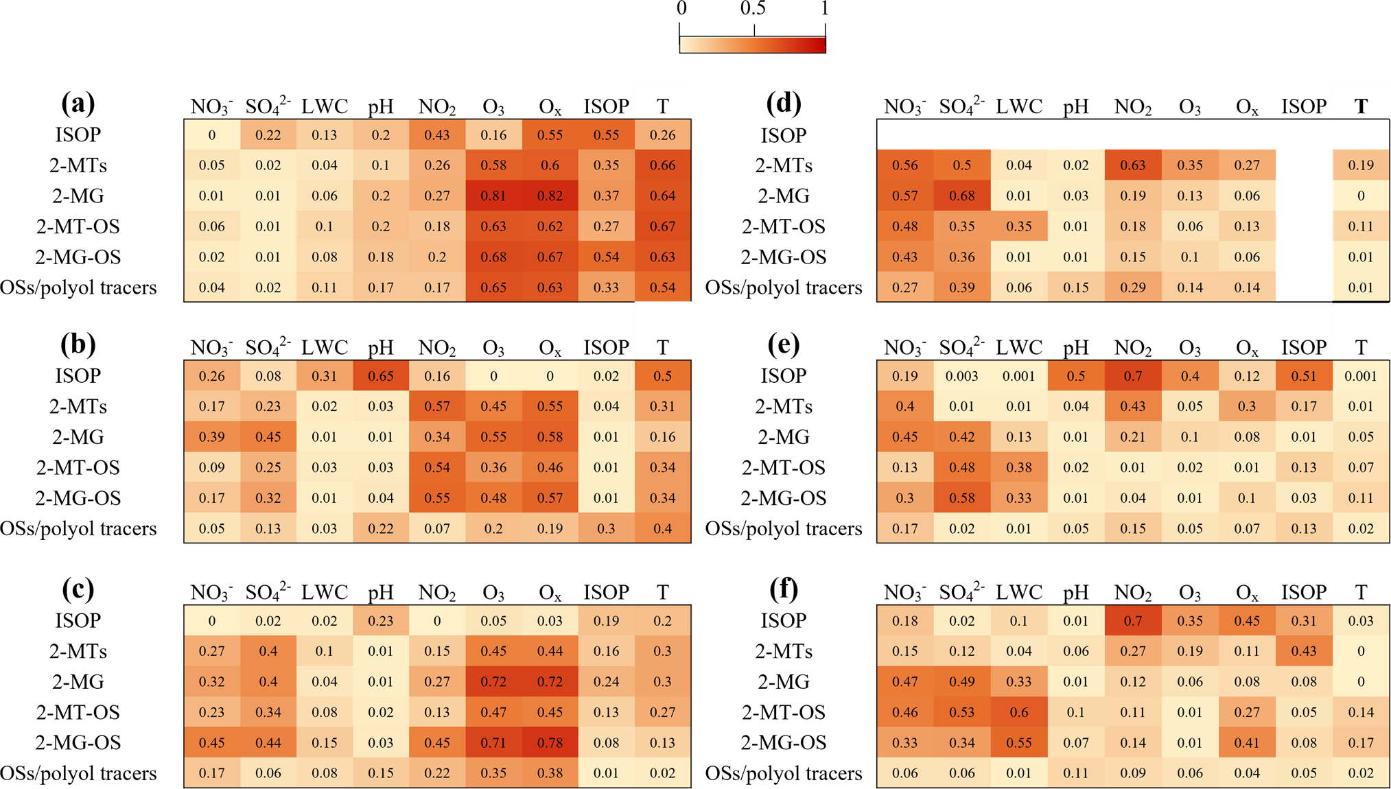 Figure 4Coefficients of correlation (r2) between iSOA compounds and various influencing factors of iSOA formation in (a–c) summer and (d–f) winter of 2015, 2019, and 2021, respectively. The ISOP is the abbreviation of isoprene.