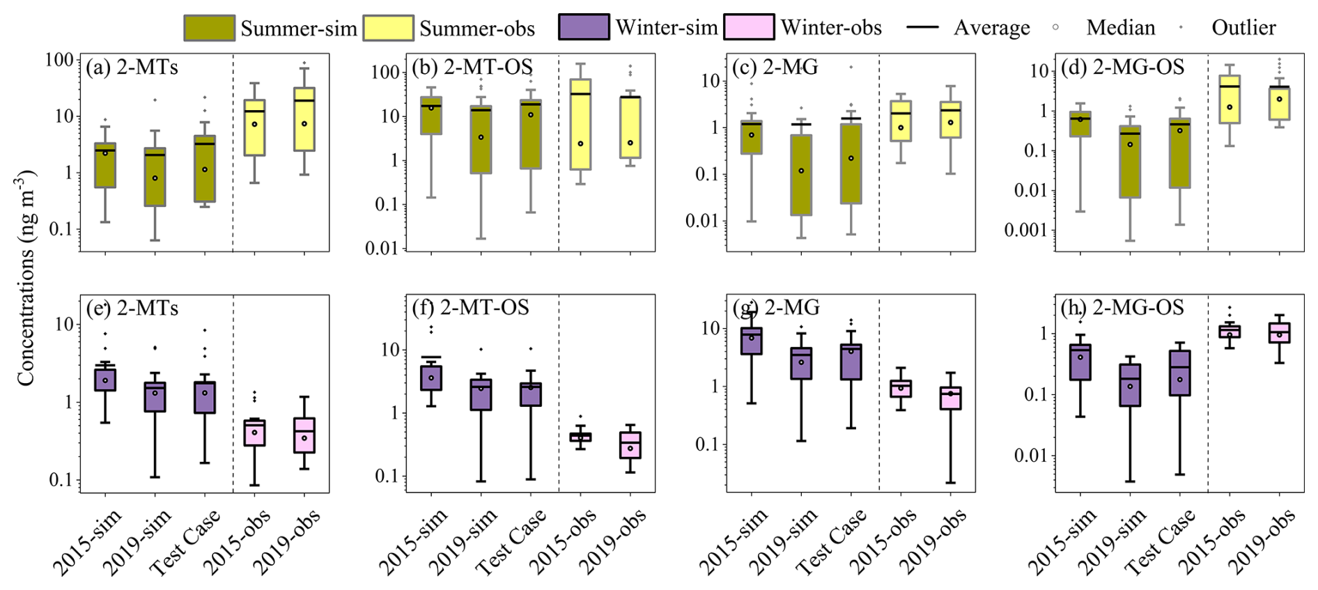 Figure 6Simulated concentrations of 2-MTs, 2-MT-OS, 2-MG and 2-MG-OS in summer (a–d) and winter (e–h) in Case 1 (2015-sim and 2019-sim) and Test Case (simulations with 2015 emissions and 2019 meteorological conditions). The observed concentrations of 2-MTs, 2-MT-OS, 2-MG, and 2-MG-OS in 2015 and 2019 are also displayed (Detailed model-measurement comparisons are provided in Sect. 3.2; after accounting for matrix effect, 2-MT-OS would decrease more sharply and 2-MG-OS would show a descending inter-annual trend, consistent with model simulations).