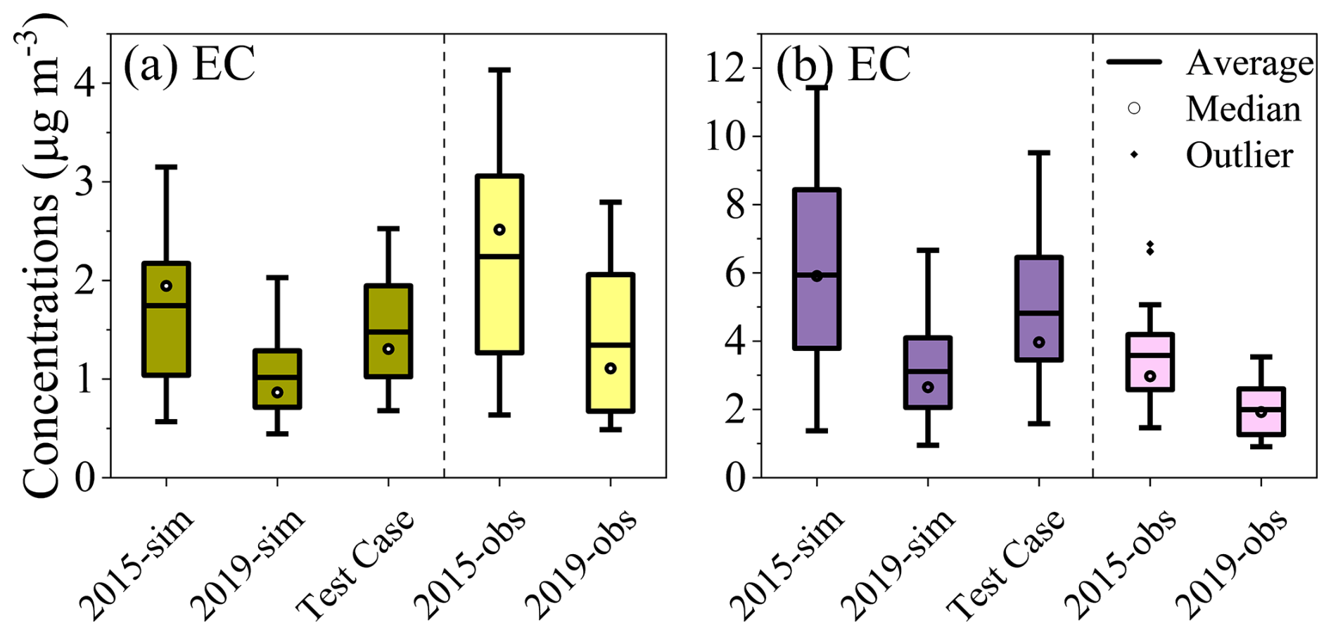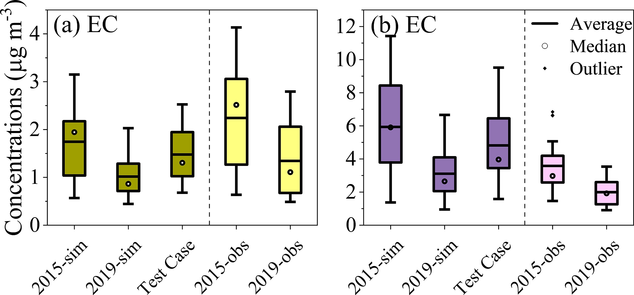 It should be noted that the variations in meteorological conditions not only affect the physical processes such as dilution and transport, but also influence the chemical processes determining the formation of iSOA. To investigate the impacts of physical and chemical factors associated with the variations in meteorological conditions on the abundance of iSOA, the concentrations of elemental carbon (EC) were simulated in the Test Case. As shown in Fig. 7, the simulated median concentrations of summertime and wintertime EC in 2019 both decreased by 32.8 %, respectively, compared to those in 2015. Since EC is a primary pollutant and chemically inert under atmospheric conditions, the variations in its concentration in the Test Case is attributed to the changes in the physical processes, contributing approximately 59.5 % of the EC reductions between 2015 and 2019 (Case 1). As a result, we could expect a similar contribution of the physical processes to the reduction in iSOA concentration. Notably, such reductions are significantly smaller than the simulated concentration reductions of iSOA in the Test case (Fig. 6), suggesting that the chemical factors associated with the changes in meteorological conditions play a crucial role in determining the trend of iSOA in Shanghai, consistent with the above analysis based on the observations. However, we note that the alternation in meteorological conditions cannot explain the observed non-declining trend of 2-MG and 2-MTs in summer, implying that some other factors that are not well represented in the CMAQ model may play a role in controlling such a trend.