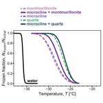 Yet we cannot exclude the possibility that experimental variability in the determination of microcline's ice nucleation activity explains the observed tail of the microcline–montmorillonite mixture compared to the microcline–quartz mixture. As shown in Fig. 3, the trend of ns vs. T for microcline derived from experimental frozen fractions does not collapse onto a single line over all studied concentrations, and in Fig. 6, the obtained fit for ns to this data thus yields a frozen fraction at lower temperatures (dashed blue line) than those observed experimentally at a nominal microcline concentration of 0.001 wt % (open diamonds). If the true activity of 0.001 wt % microcline is represented by the dashed blue line, then the frozen fraction observed in Fig. 6a for microcline–quartz is explained by the inherent activity of a 0.1 wt % quartz suspension, and the frozen fraction observed in Fig. 6b for microcline–montmorillonite is explained by the additive activity of each constituent, as depicted by the solid purple line calculated using Eq. (4).