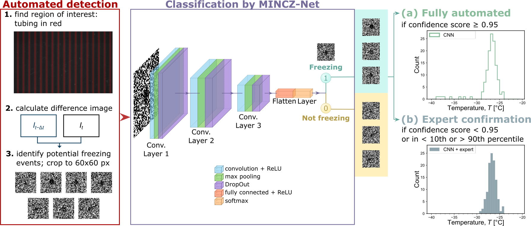 Figure 1Image processing workflow consisting of automated detection of potential freezing events and a convolutional neural network, MINCZ-Net, for their classification to obtain either (a) a fully automated count of frozen droplets as a function of temperature or (b) a count that is confirmed by the expert.