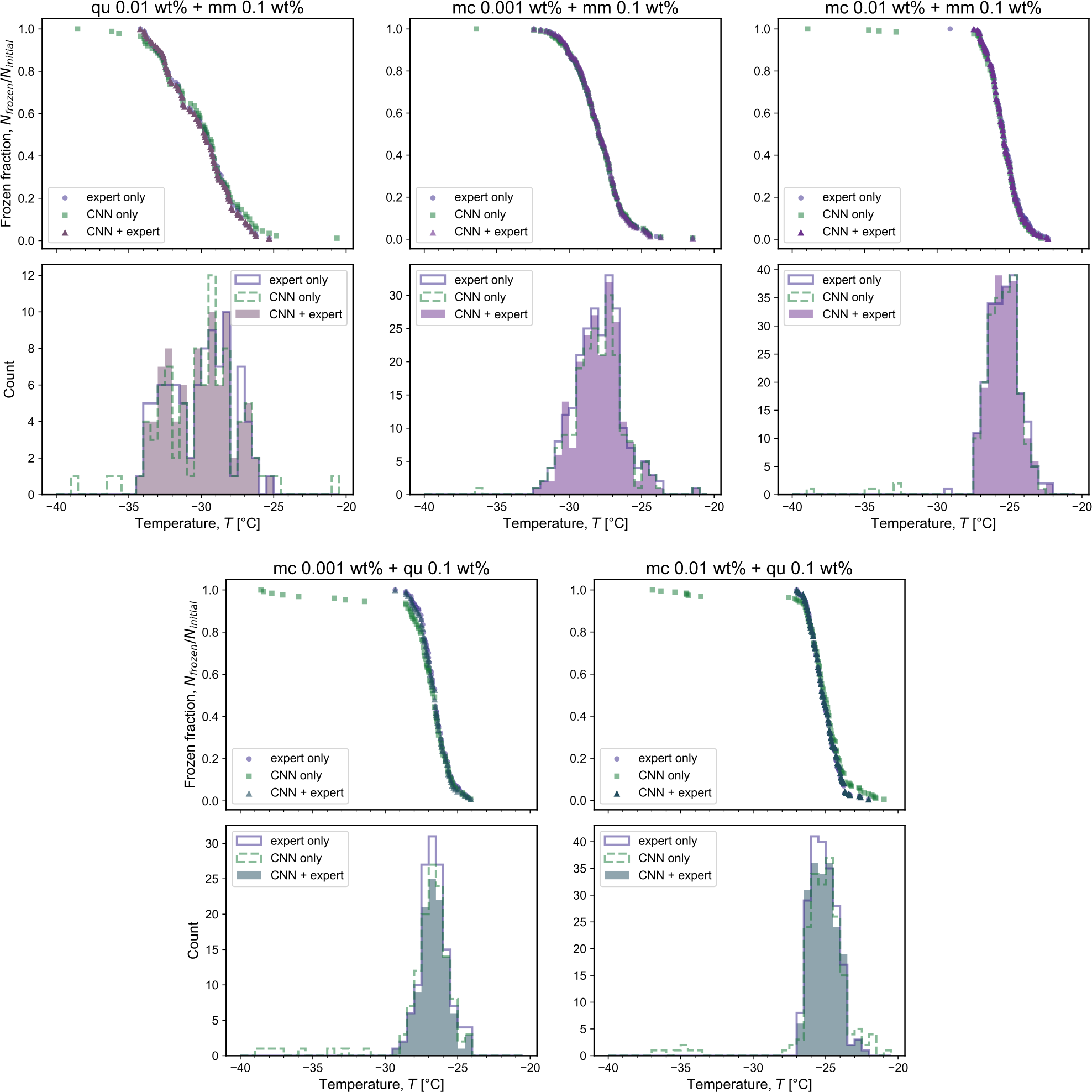 Since the neural network training was carried out for one experiment for each single mineral, we tested the accuracy of the resulting classification for five other cases – one for each binary mineral mixture containing microcline (mc), quartz (qu), and montmorillonite (mm), as shown in Fig. 2. Results from three methods of classifying potential freezing events are shown: by the expert only, fully automated by the CNN (Fig. 1a), and with expert confirmation of the CNN categorization (Fig. 1b). All three methods yielded similar counts of freezing events as a function of temperature. The most important difference is in the tails of the frozen fraction distribution, where the expert alone and the combined CNN–expert methods identified fewer freezing events than the CNN alone. False positives may occur with the CNN due to noise or optical interference (e.g., dust moving in between frames) resembling a freezing event with a localized increase in pixel brightness, and thus the CNN method overestimates the number of freezing events. The expert-only method generally identifies more freezing events than the combined CNN–expert method due to the false negative categorizations by the CNN; other deviations between these methods can also originate from expert classification error. Between the expert-only and the CNN–expert methods, the CNN–expert analysis is beneficial when considering the required analysis time for one experiment (up to 1000 potential freezing events): more than 1 h is needed to classify all the possible freezing events by an expert alone, while less than 15 min is typical for the CNN and expert together. Thus, the best methodology for counting the number of frozen droplets is a combination of the CNN with expert confirmation, and this is used in all experiments.