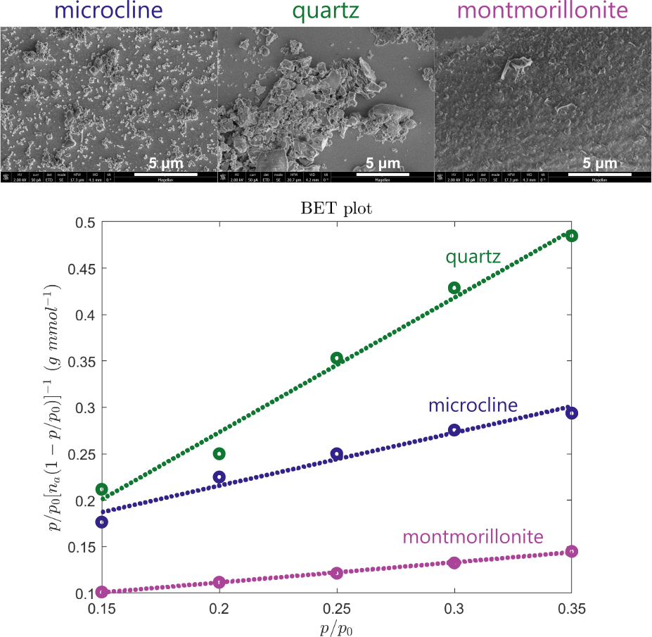 Figure 4Scanning electron microscopy images and linear regressions performed on adsorption isotherm measurements via dynamic vapor sorption (DVS; see Fig. A2) for the determination of the BET surface area of each mineral (microcline, quartz, and montmorillonite) after sonication, filtration, and drying.