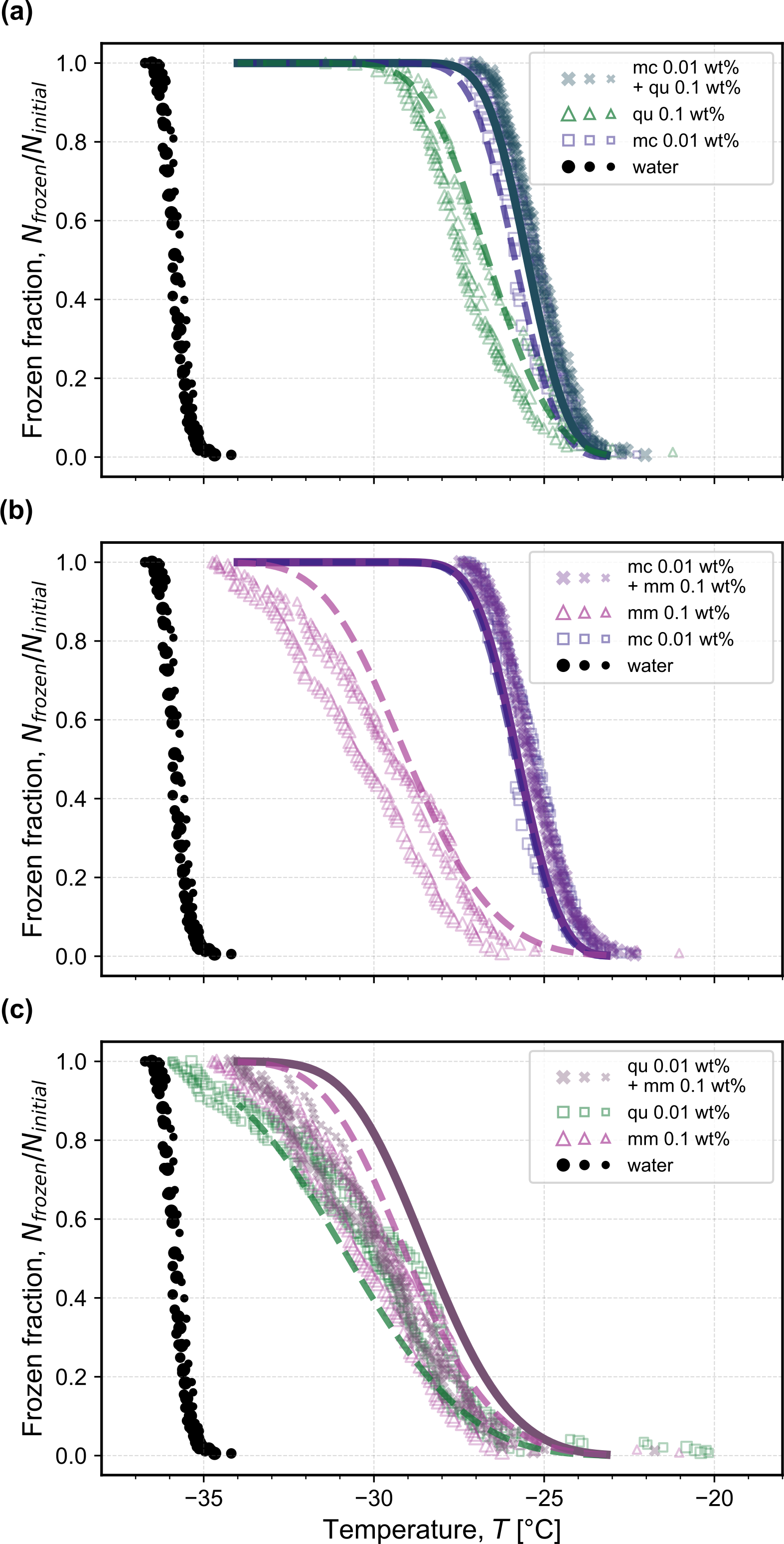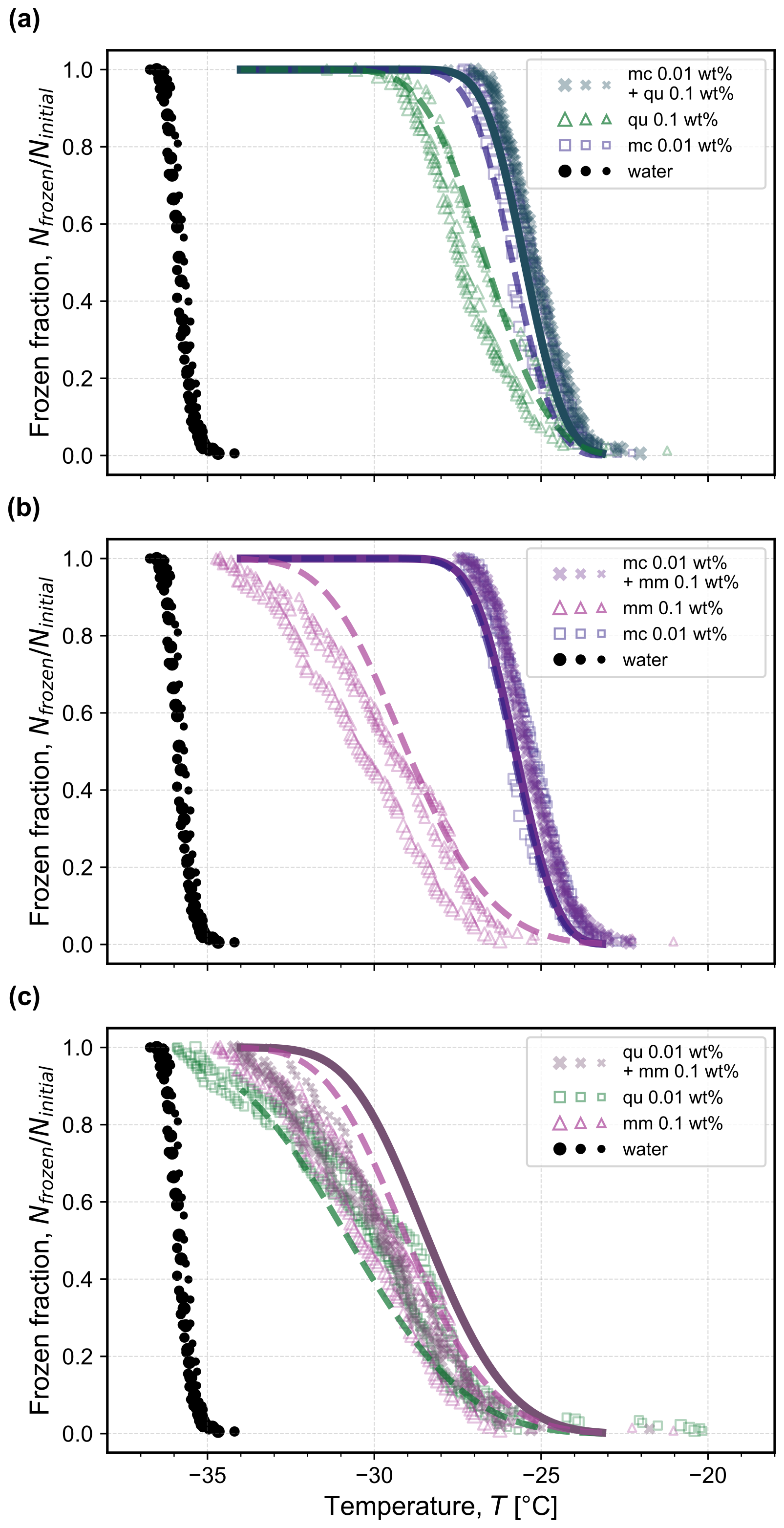 When the microcline concentration was decreased from 0.01 wt % to 0.001 wt % in the binary mixtures with quartz and montmorillonite, the nucleation temperatures of the droplets decreased accordingly, as shown in Fig. 6. In the binary mixture containing microcline and quartz, there is no significant change in the frozen fraction curves compared to the individual minerals' frozen fractions that were observed experimentally (open triangles and diamonds). In the binary mixture containing microcline and montmorillonite, however, there was a significant proportion of droplets freezing in the tail end at even lower temperatures than observed for droplets containing pure microcline. This observation can also be seen by directly comparing the microcline–quartz mixture with the microcline–montmorillonite mixture, as shown in Fig. 6c. Here, approximately 15 % of the microcline–montmorillonite droplets froze at temperatures below −30 °C, where there was no observed freezing for the microcline–quartz mixture.