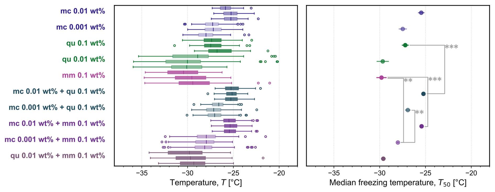 Figure 7Box plot of the freezing temperatures for a subset of all experiments shown in Fig. A3: pure microcline (mc 0.01 wt % and 0.001 wt %), quartz (qu 0.1 wt % and 0.01 wt %), montmorillonite (mm 0.1 wt %), and all studied binary mixtures in triplicate. In each box plot, the vertical line indicates the median freezing temperature, the upper and lower bounds of the box stretch across the 25th to 75th percentiles, whiskers span the maximum and minimum temperatures, and open circles are outliers beyond 1.5 times the interquartile range. The corresponding average median temperature T50 is plotted for each set of three experiments (error bars show one standard deviation). Four significant differences in median freezing temperature are labeled with two or three asterisks to denote that Welch's unequal variances t test yielded p≤0.01 () or p≤0.001 ().