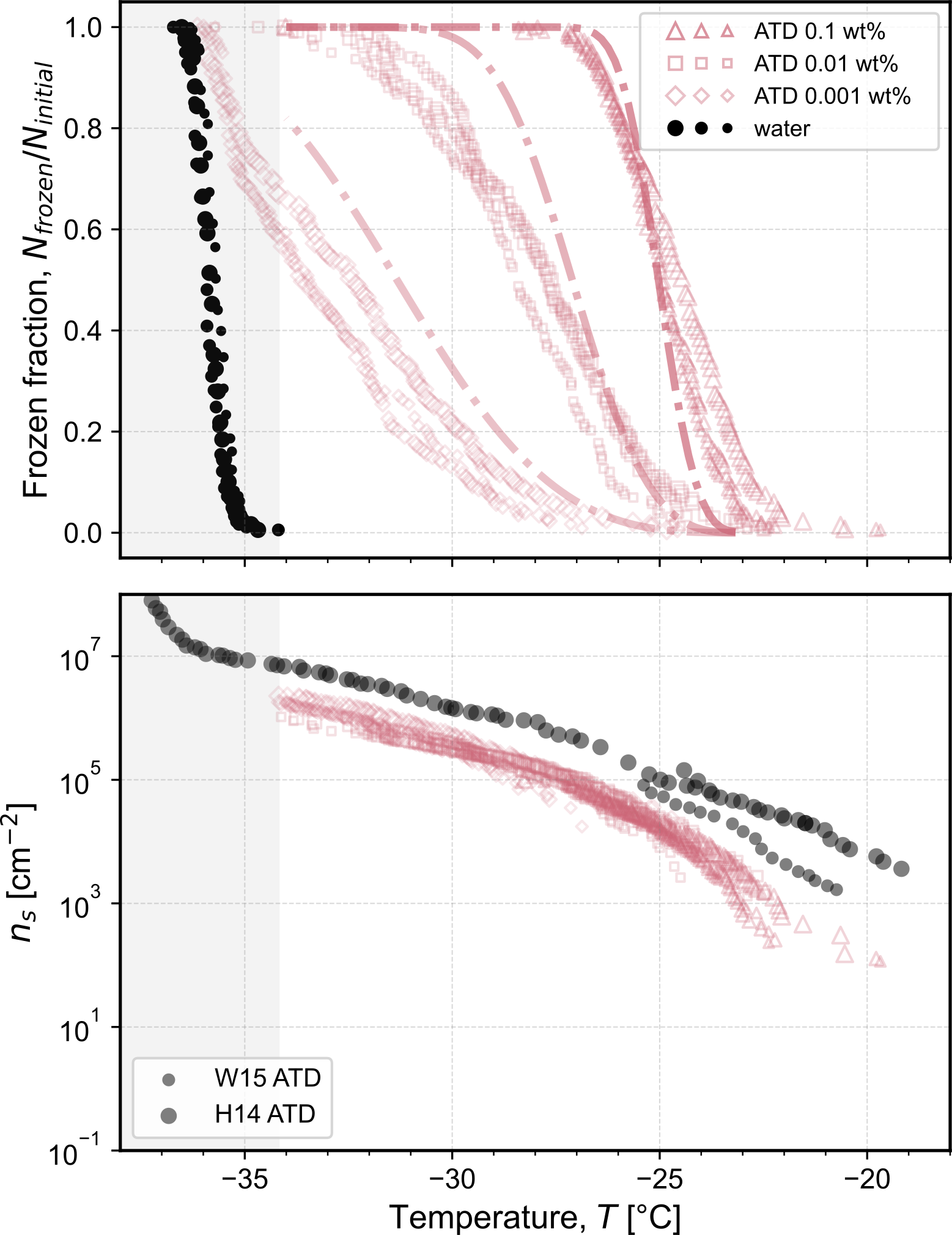 Figure 8Frozen fraction of droplets as a function of temperature for Arizona Test Dust (ATD; A1 Ultrafine) at concentrations of 0.1 wt %, 0.01 wt %, and 0.001 wt %. The measured frozen fraction for the homogeneous freezing of water droplets of the same volume shown with black symbols is reproduced from Isenrich et al. (2022). Each symbol type represents a different concentration, and different symbol sizes represent independent populations of monodisperse droplets with diameters of approximately 75 µm cooled at 1 K min−1 (temperature uncertainty is 0.2 K; Isenrich et al., 2022). The dash-dotted lines are predictions (not fits) of frozen fractions calculated using Eq. (4) with inputs of each pure mineral's nucleation site density vs. temperature shown in Fig. 3 assuming an ATD composition of 29 wt % microcline, 23 wt % quartz, and 25 wt % montmorillonite. The corresponding number of nucleation sites per unit surface area, ns, is plotted as a function of temperature according to Eq. (1) from the experimental frozen fractions using a specific surface area of 22 m2 g−1, as reported by for particles between 5 and 10 µm by Ibrahim et al. (2018). For comparison, experimental data of ns are plotted (circles) and labeled as: W15 digitized from Wheeler et al. (2015); and H14 digitized from Hader et al. (2014) (data labeled unfiltered). The shaded grey area at the lowest temperatures highlights the region where the homogeneous nucleation of pure water in 75 µm droplets occurs; ns values are thus not plotted in this region.