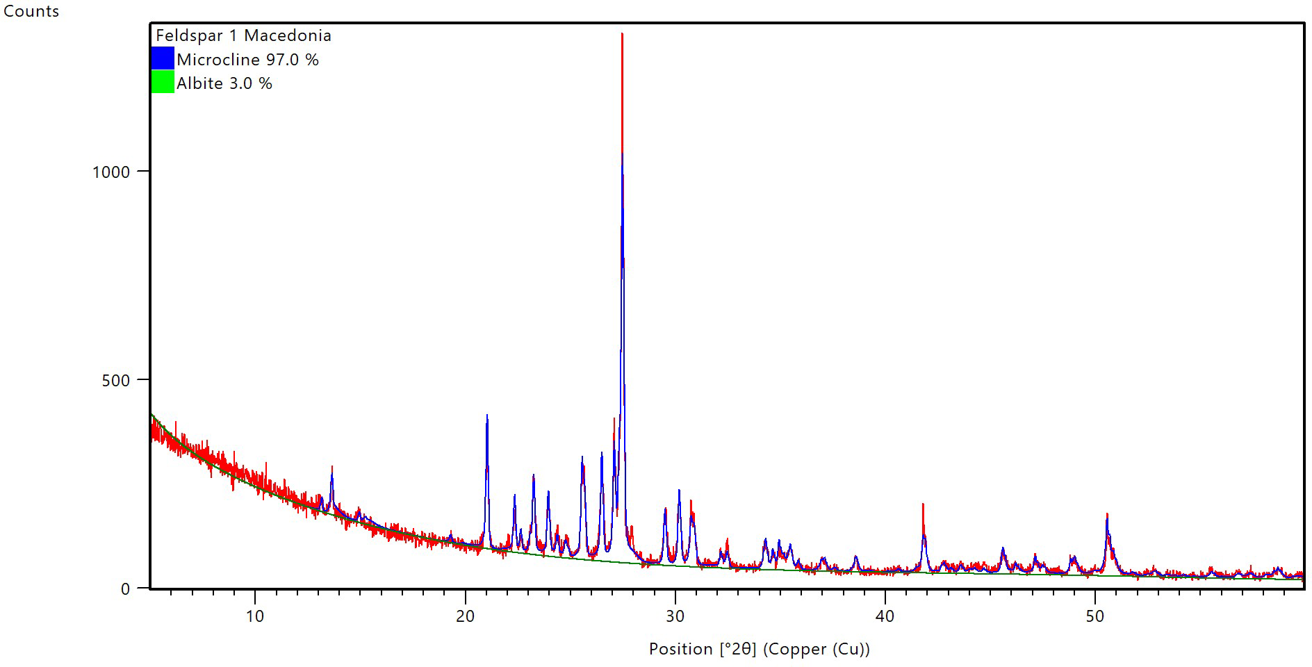 Figure A1XRD spectrum of the unprocessed microcline sample from Macedonia obtained from the ETH Mineralogical and Petrographical Collection.