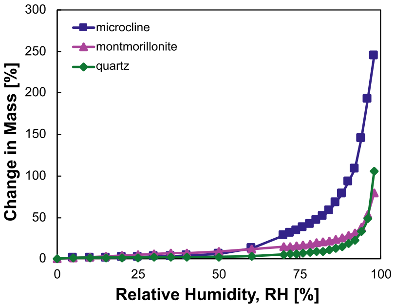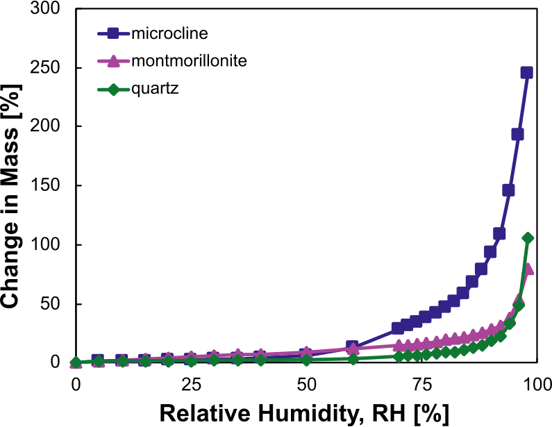 Figure A2Adsorption isotherms from dynamic vapor sorption (DVS) measurements for each pure mineral: microcline, montmorillonite, and quartz.