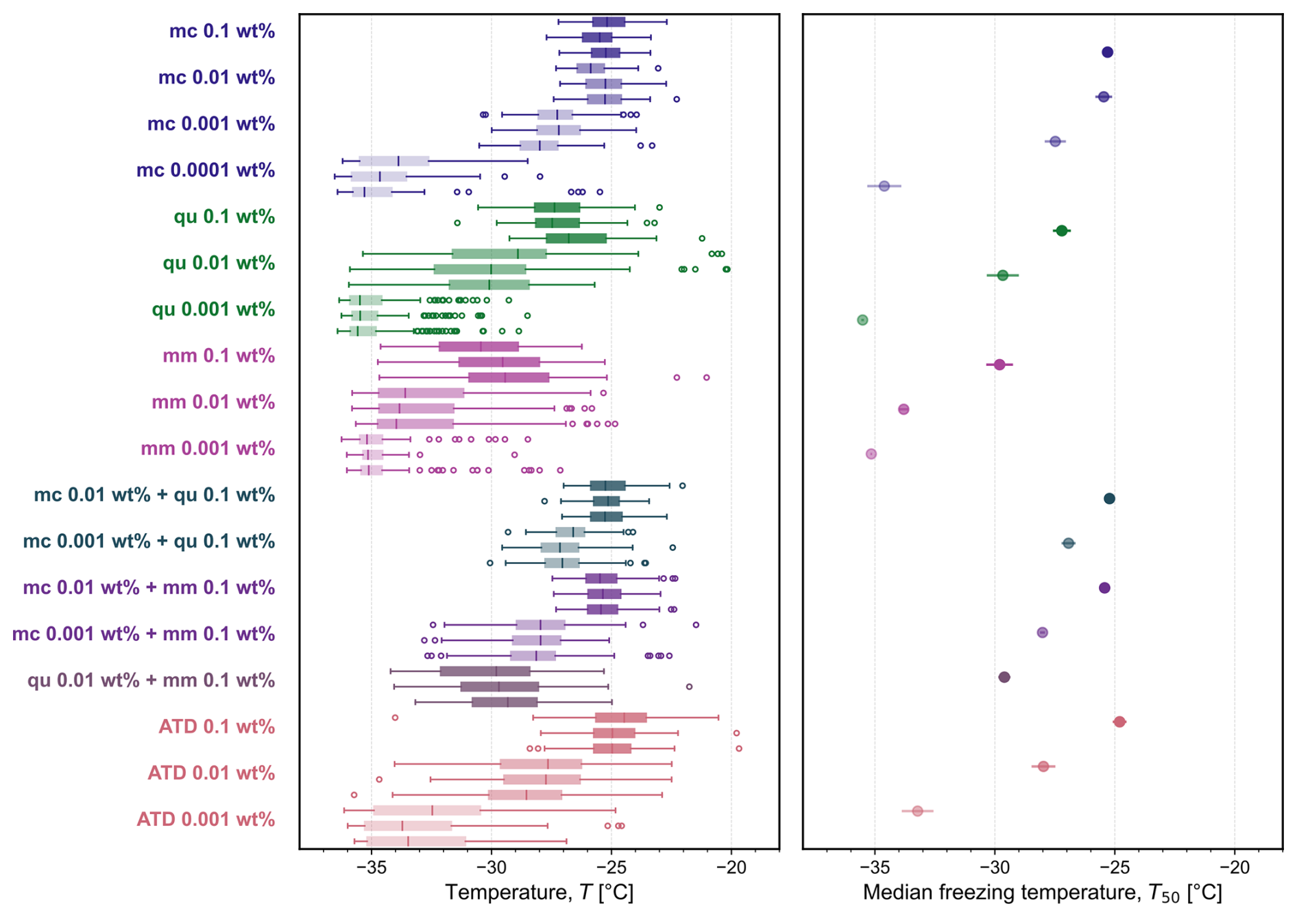 Figure A3Box plots of the freezing temperatures for each experiment containing microcline (mc), quartz (qu), montmorillonite (mm), and Arizona Test Dust (ATD) and the corresponding average median temperature T50 for each set of three experiments (error bars show one standard deviation). In each box plot, the vertical line indicates the median freezing temperature, the upper and lower bounds of the box stretch across the 25th to 75th percentiles, whiskers span the maximum and minimum temperatures, and open circles are outliers beyond 1.5 times the interquartile range.