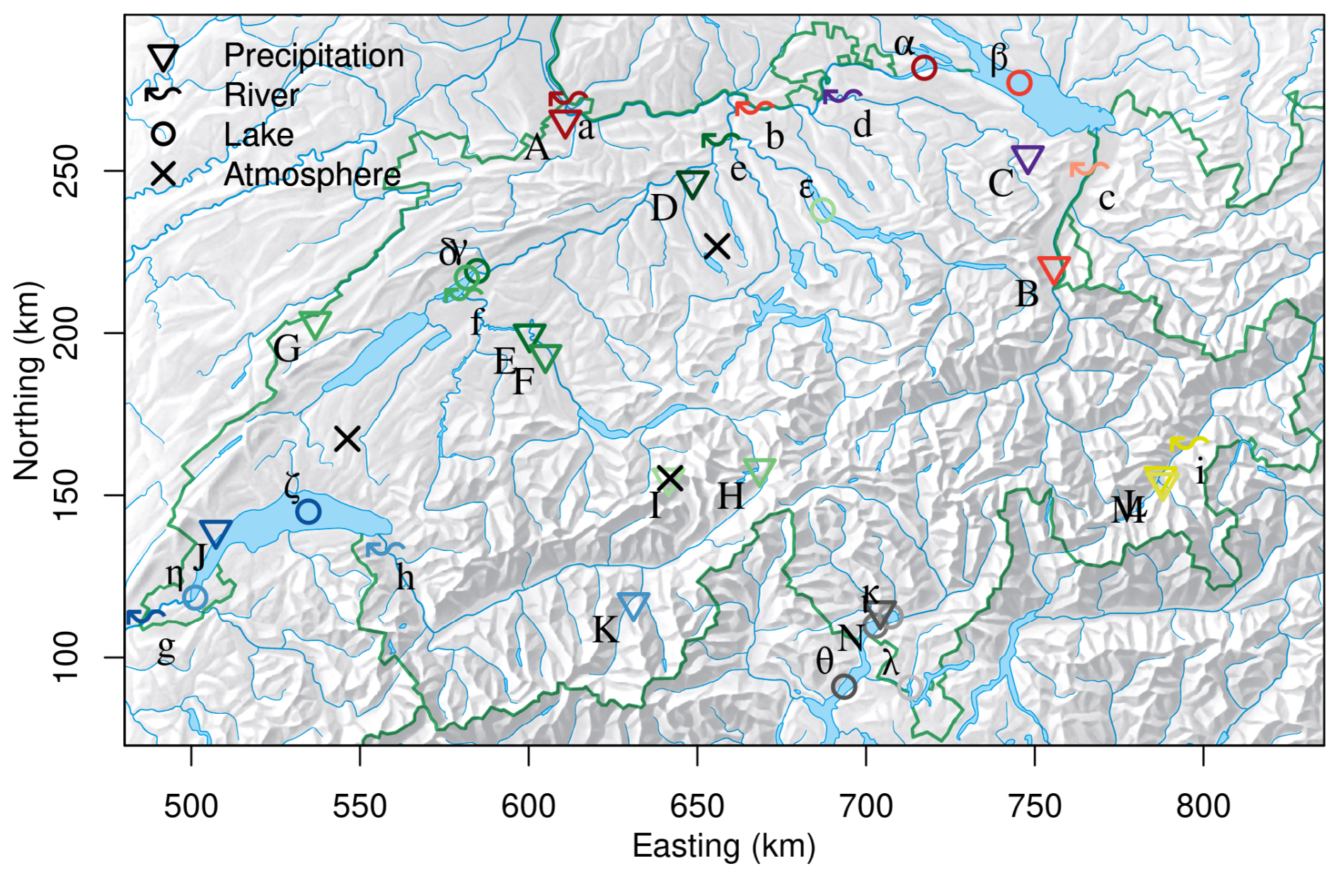 Figure 1Sites with TFA (coloured symbols) and HFO (black crosses) observations in Switzerland. Colours refer to different river basins: Rhine (different shades of red), Rhone(shades of blue), Aare/Limmat (shades of green), Thur (purple), Inn (yellow), Ticino (grey). Precipitation, river and lake sampling sites are marked by triangles/upper case letters, wavy arrows/lower case letters, and open circles/Greek letters, respectively. Letters refer to individual sites as itemised in Table 1. Coordinates refer to Swiss coordinate system (LV03).