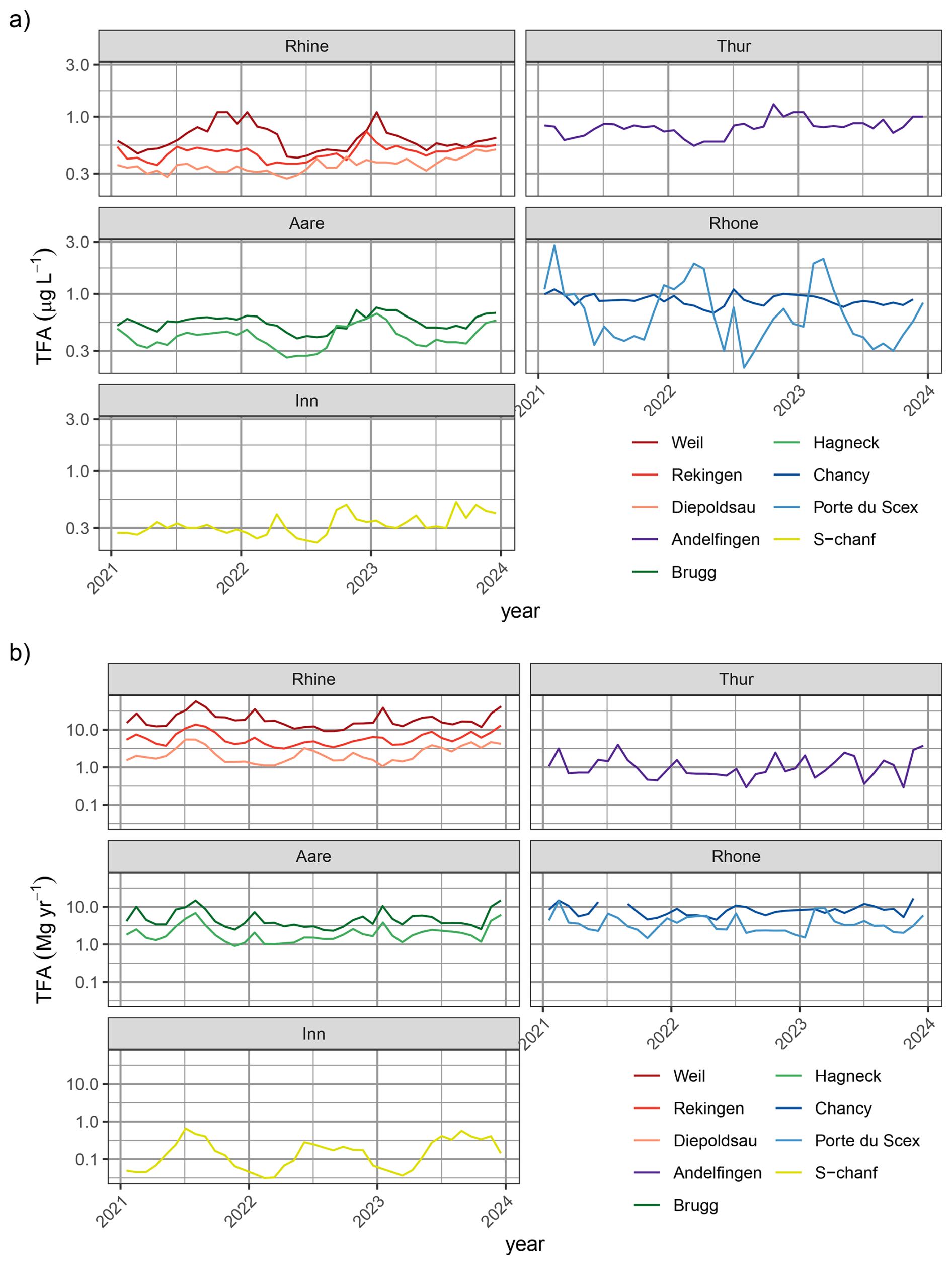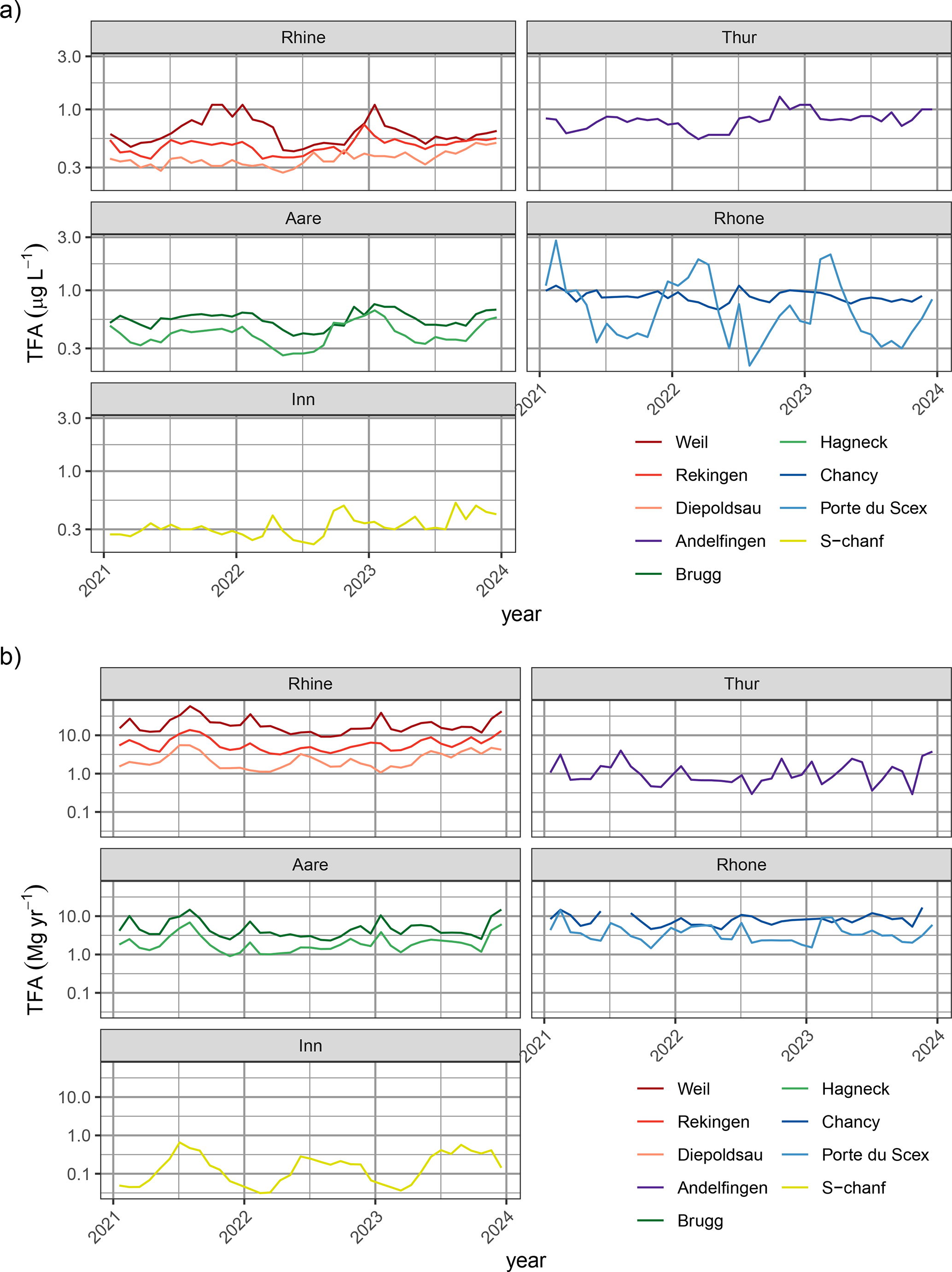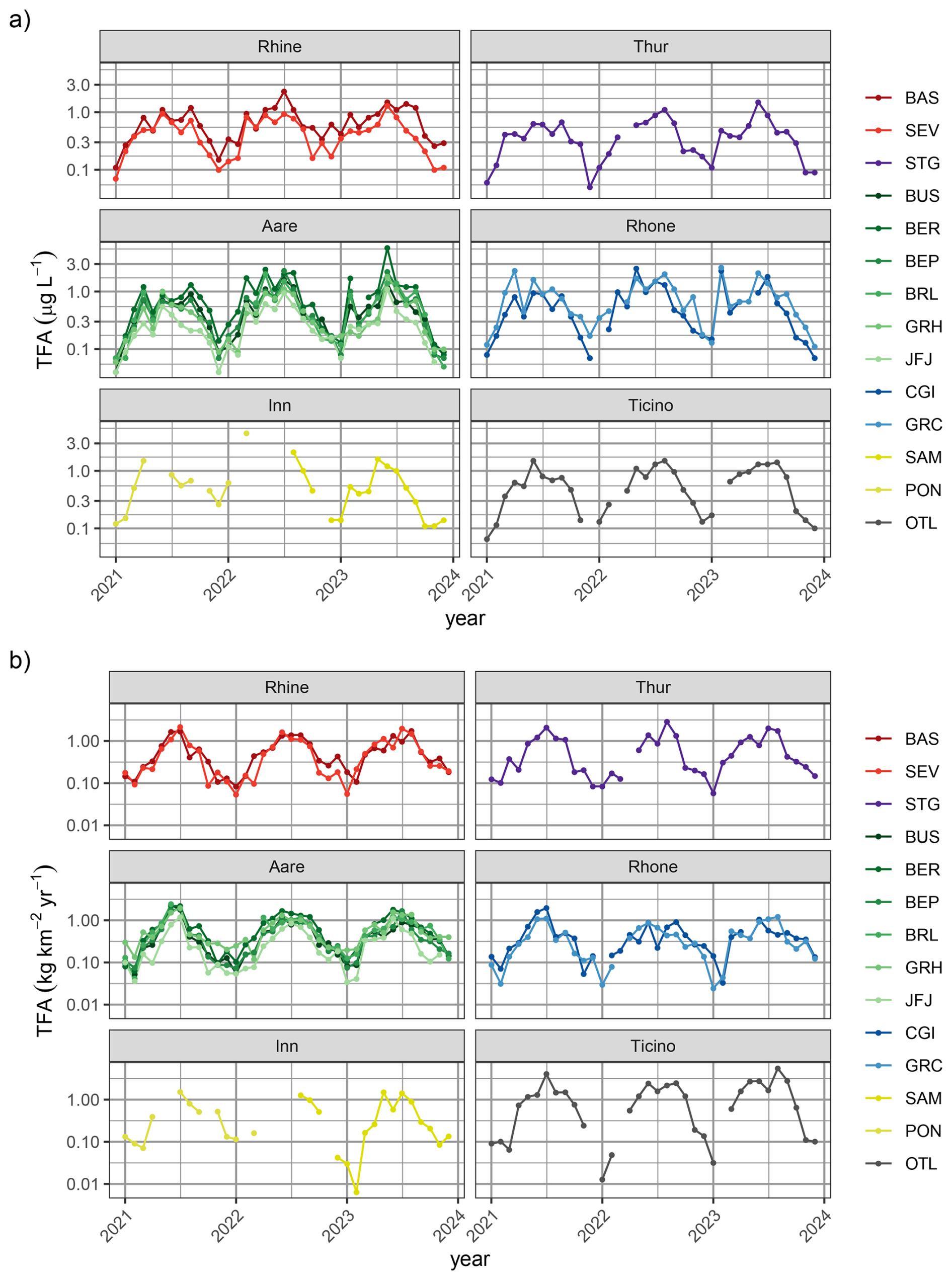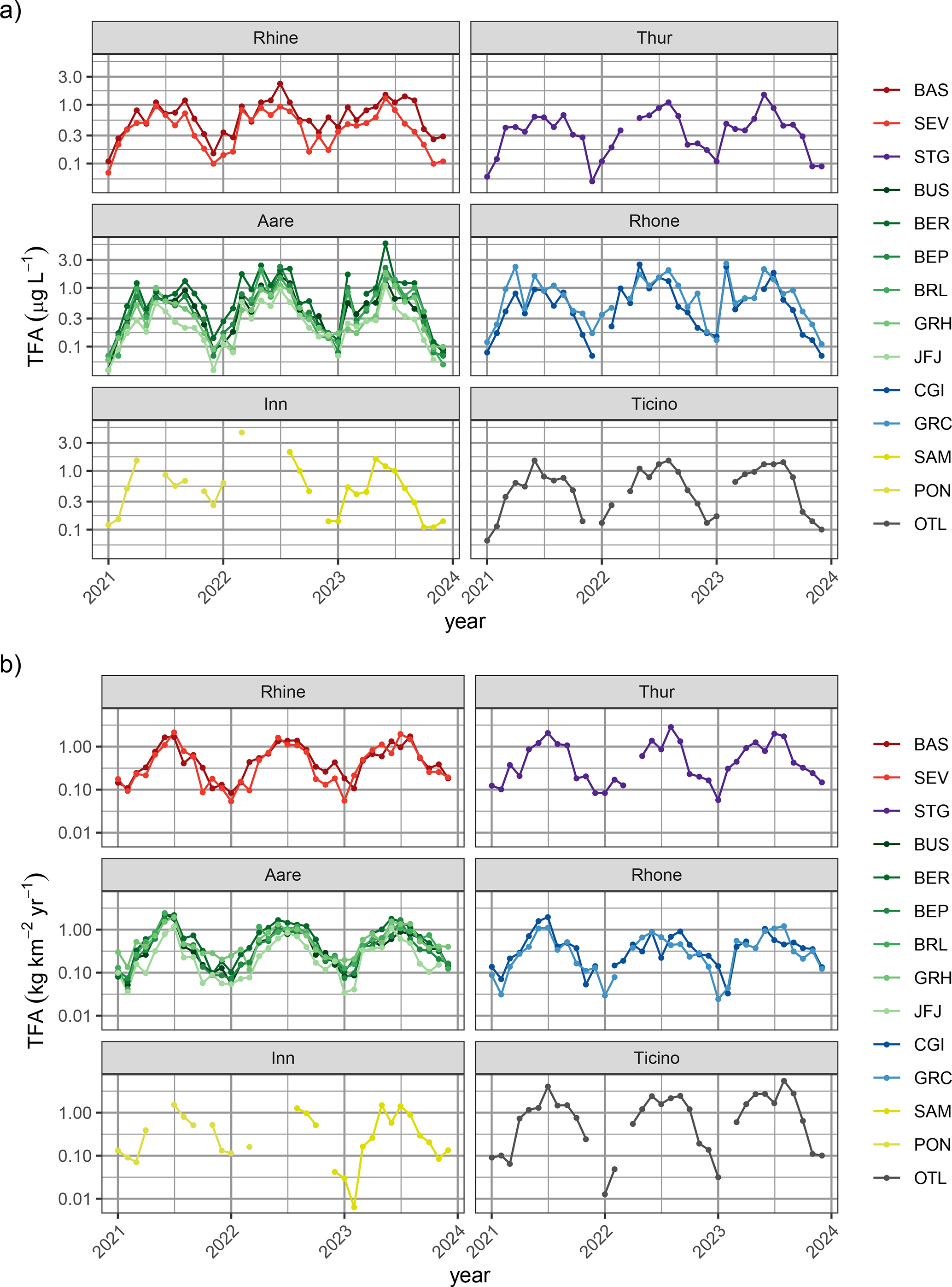 Figure 3Time series of (a) measured TFA concentration in monthly river samples and (b) estimated TFA loads in rivers. Sites are coloured by different catchments: Rhine (red), Thur (purple), Aare (green), Rhone (blue), Inn (yellow). Darker colours represent sites farther down-stream in the respective catchment. Note logarithmic y-axis scale.