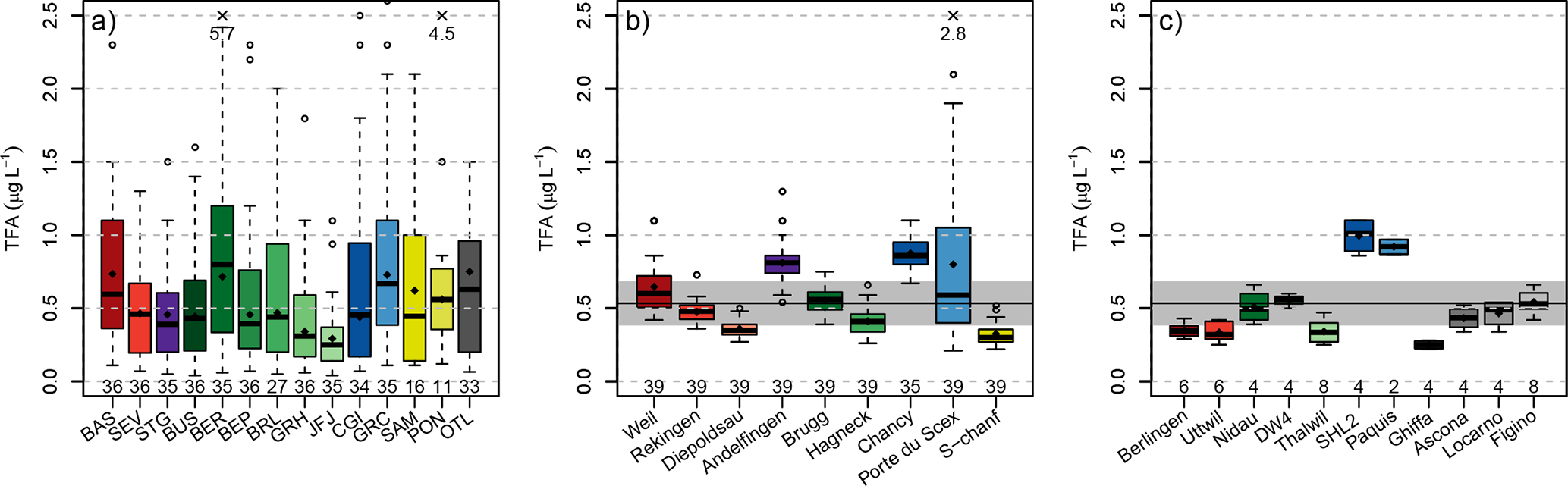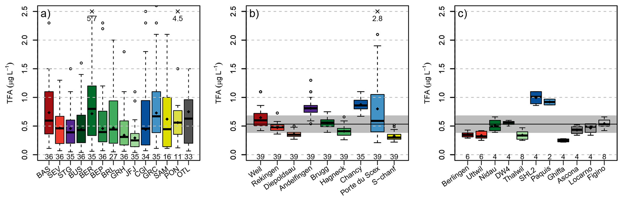 Figure 4Boxplot summary of observed TFA concentrations in (a) rainwater, (b) rivers, and (c) lakes. Boxplot centre lines represent median values, the box the inter-quartile range and the whiskers the range of continuous data (largest/smallest data point that lies 1.5 times the inter-quartile range outside the box). Individual observations outside this range are represented as outliers (empty circles). Numbers below the boxplots give the number of samples at each site. Numbers at the top give values of individual outliers beyond the plot range. The black horizontal line and grey bar in panels (b) and (c) indicate the average TFA concentration in rainwater. Sites are coloured by different catchments: Rhine (red), Thur (purple), Aare (green), Rhone (blue), Inn (yellow), Ticino (grey). Darker colours represent sites farther down-stream in the respective catchment.