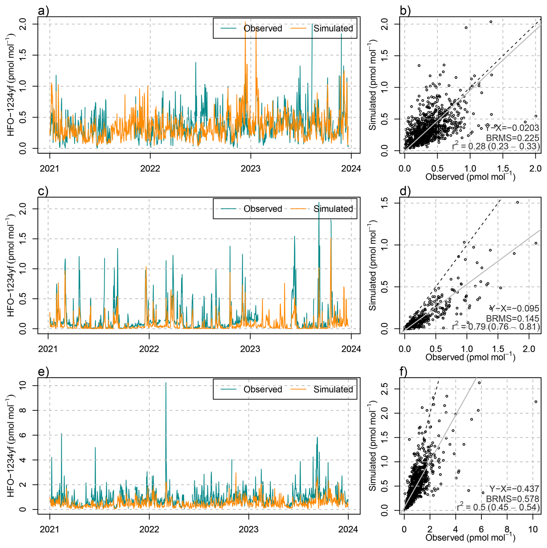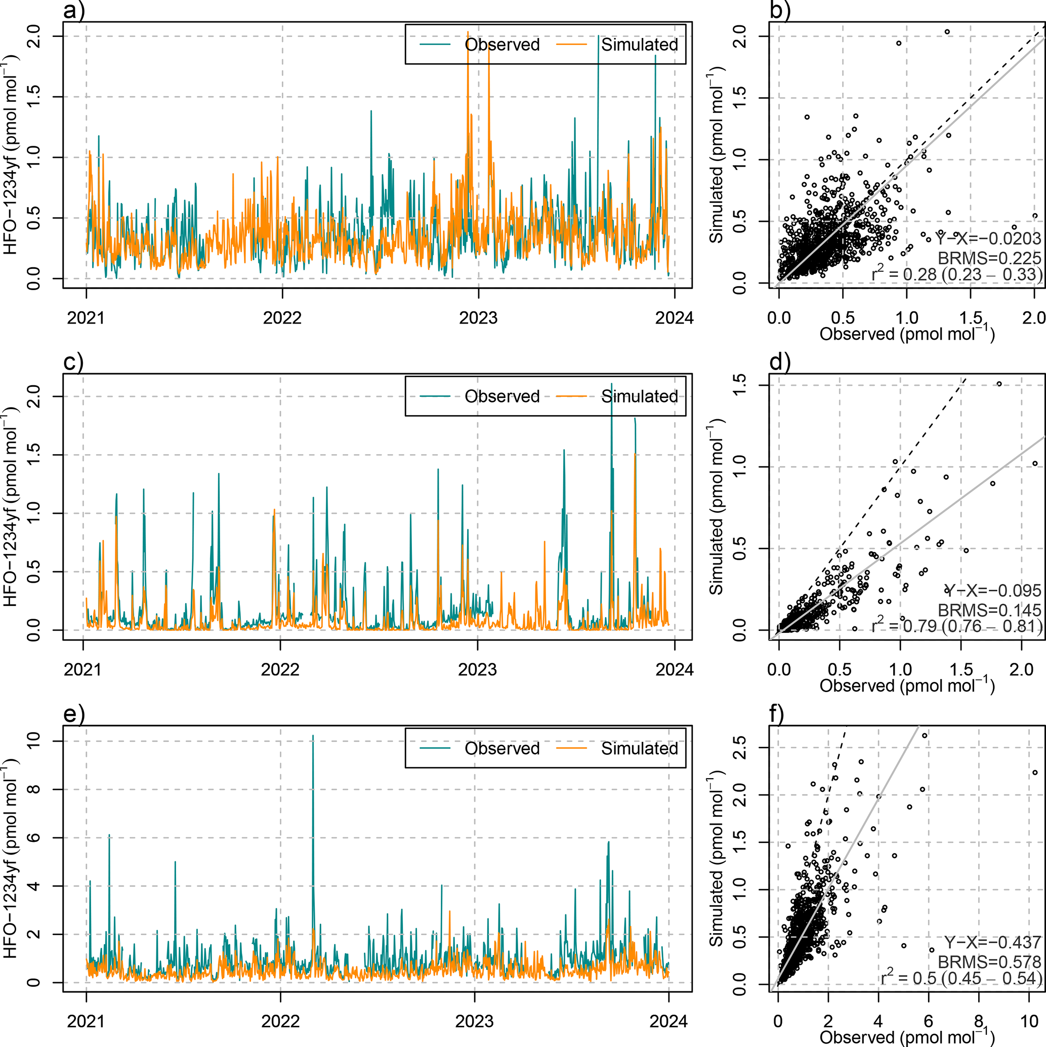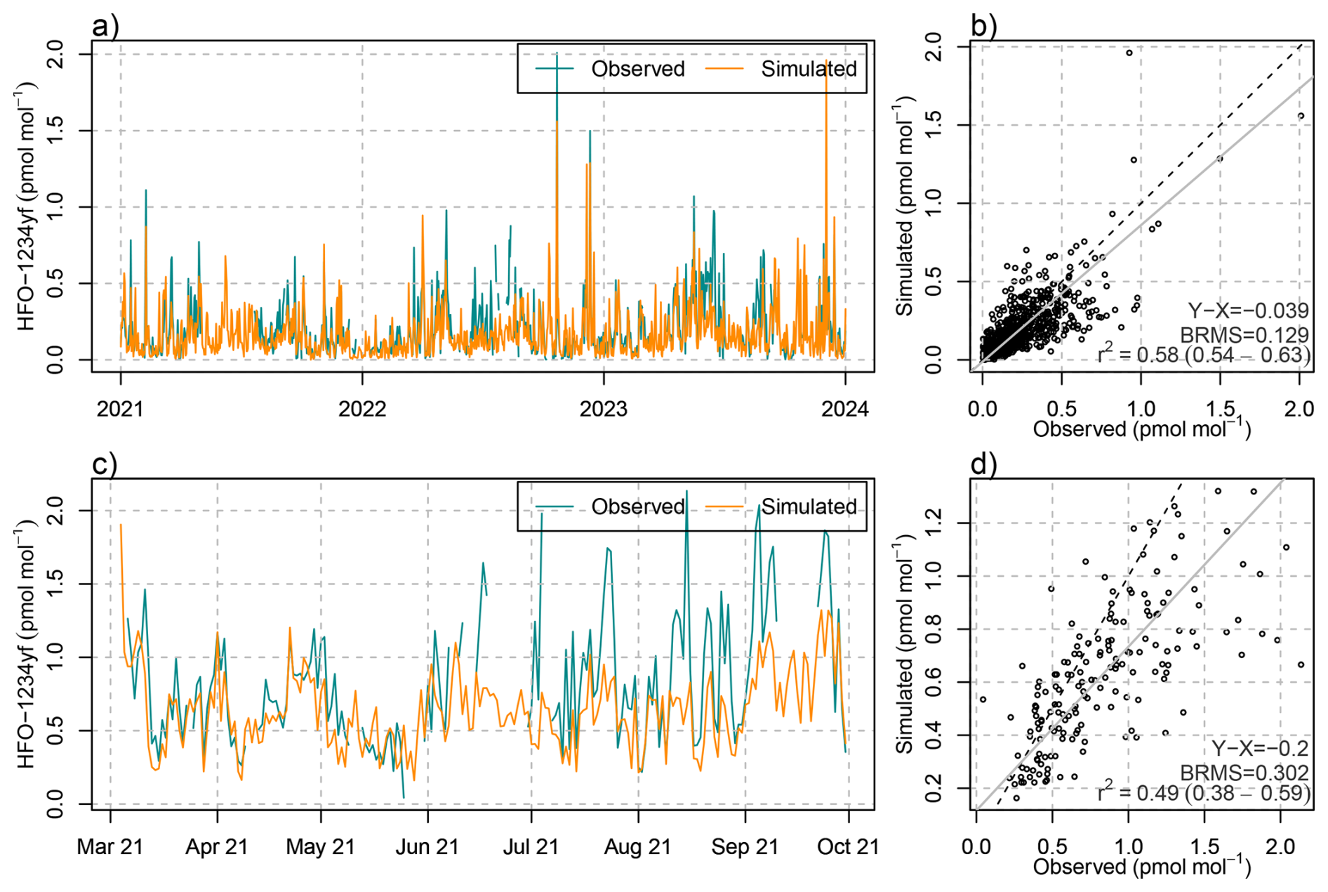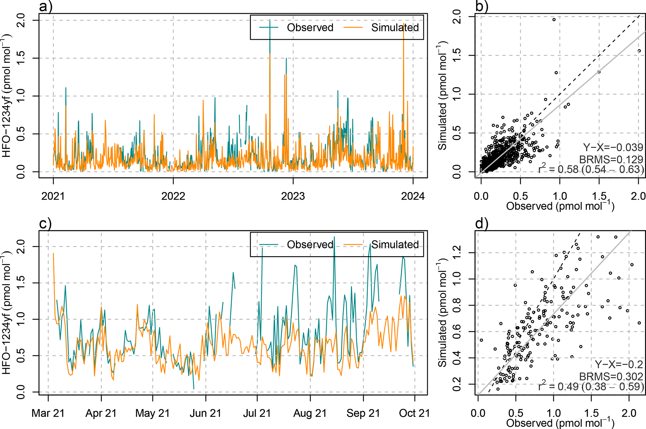 Figure 5(a, c) Temporal evolution of (blue) observed and (orange) simulated daily mean mole fractions of HFO-1234yf at (a) Jungfraujoch and (c) Sottens. (b, d) Scatter plot including (grey) linear regression, (dashed) 1-to-1 line, and comparison statistics: bias (X-Y), bias-corrected root mean squared error (BRMS), squared Pearson's correlation coefficient, R2, at (b) Jungfraujoch and (d) Sottens.