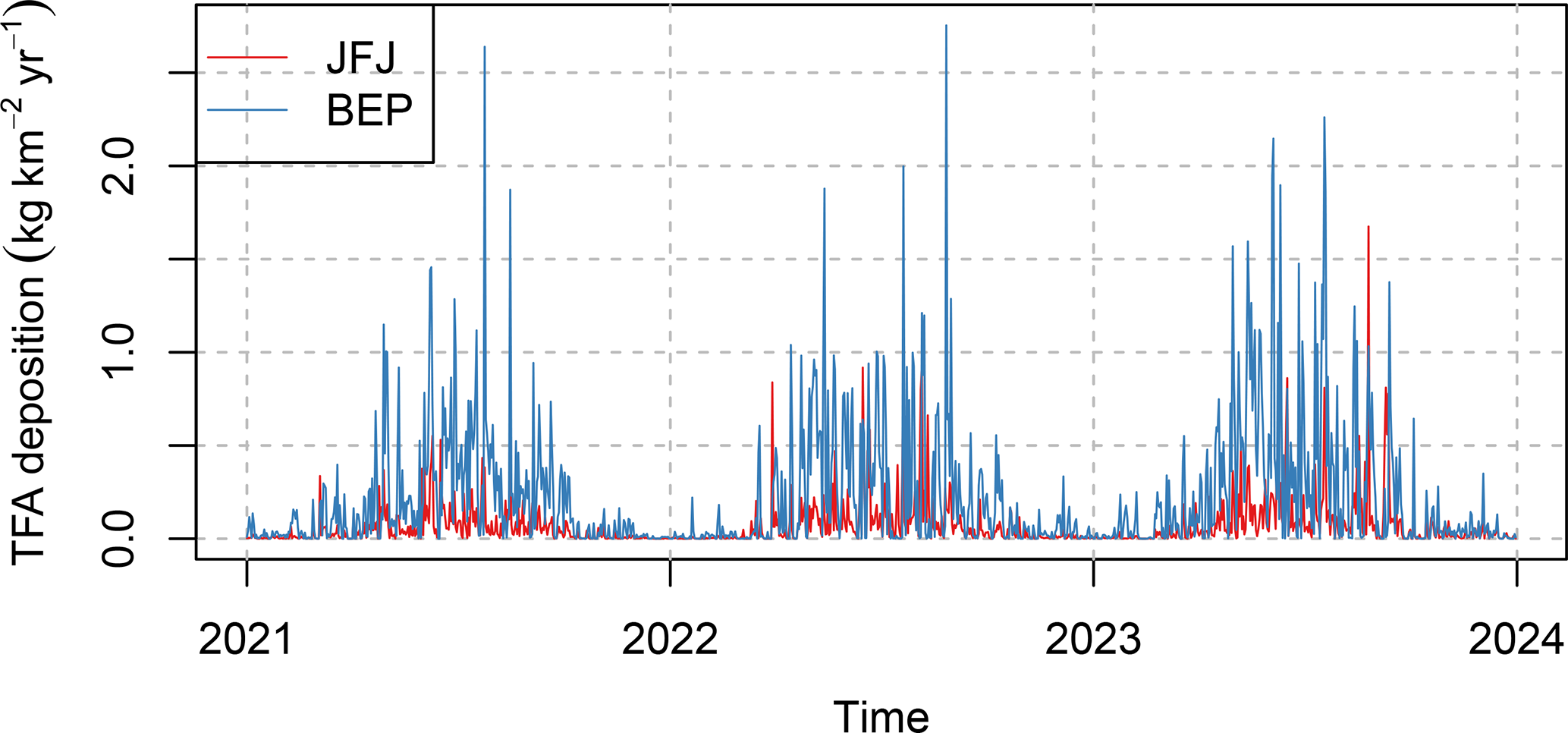 High TFA concentrations are not necessarily connected with large TFA deposition loads, but may arise from small precipitation amounts as well. Observed TFA concentrations in precipitation were converted into TFA deposition rates using monthly precipitation amounts. TFA deposition rates shared the same seasonal features as the TFA concentrations with largely increased rates during the summer months (Fig. 2b). Furthermore, differences between river basins are more clearly discernible during the summer. By far the largest average TFA deposition rates were observed south of the Alps at Locarno (OTL, 1.28 ), whereas deposition rates in the central Alps (Jungfraujoch, JFJ, 0.31 , and Grächen St. Niklaus, GRC, 0.41 ) were smallest. The average TFA deposition rate across all sites was 0.59 ± 0.23 for the years 2021 to 2023 (here, we explicitly exclude the samples taken in late 2020 to rule out seasonal effects in the calculation of the average).