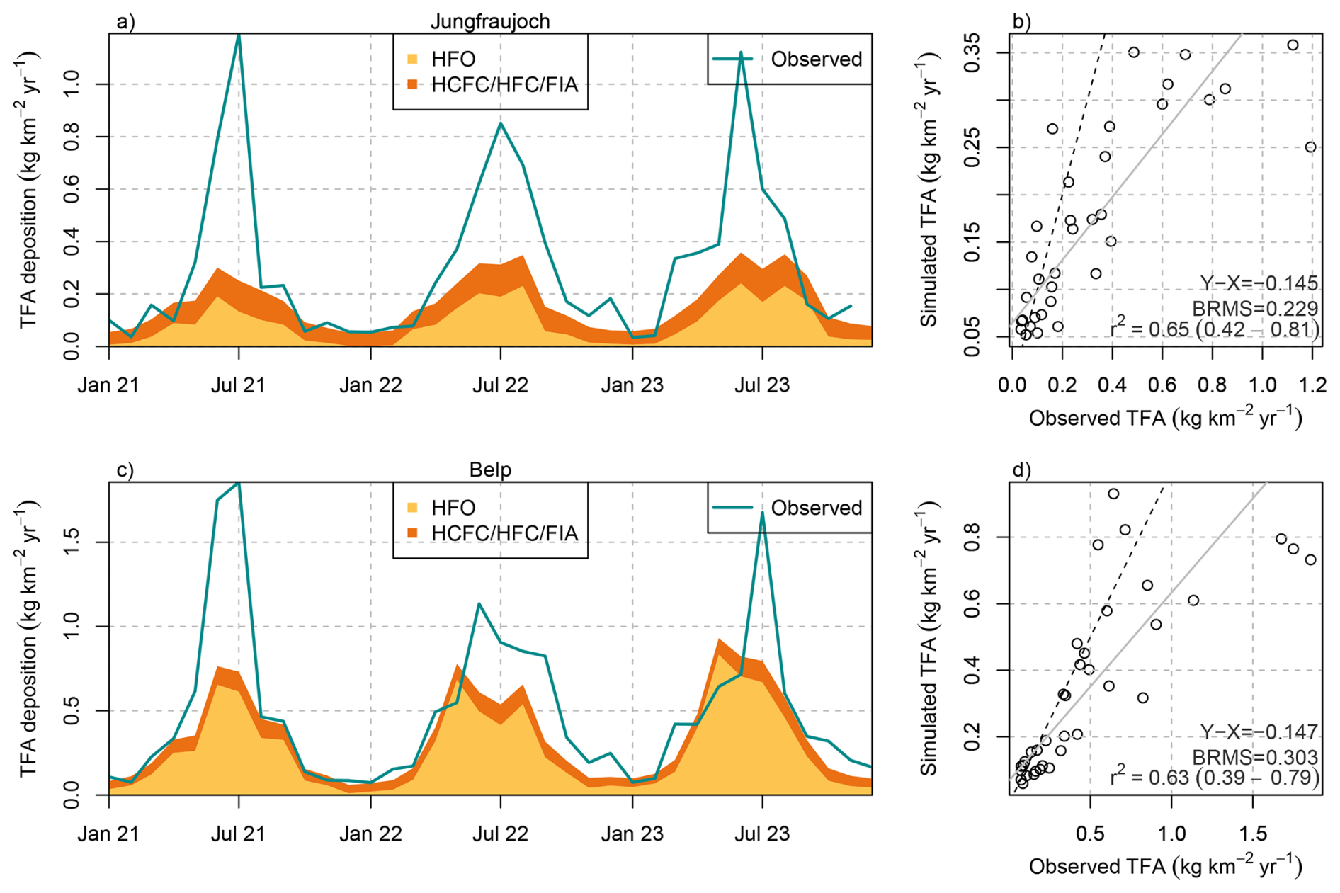 Figure 8Comparison between monthly observed (green line) and simulated total (wet+dry) TFA deposition from HFOs (yellow) and HCFCs/HFCs/FIAs (orange) at (a, b) Jungfraujoch and (c, d) Belp. (b, d) Scatter plot including linear regression line (grey), 1-to-1 line (dashed), and comparison statistics: bias (X-Y), bias-corrected root mean squared error (BRMS), squared Pearson's correlation coefficient, R2.