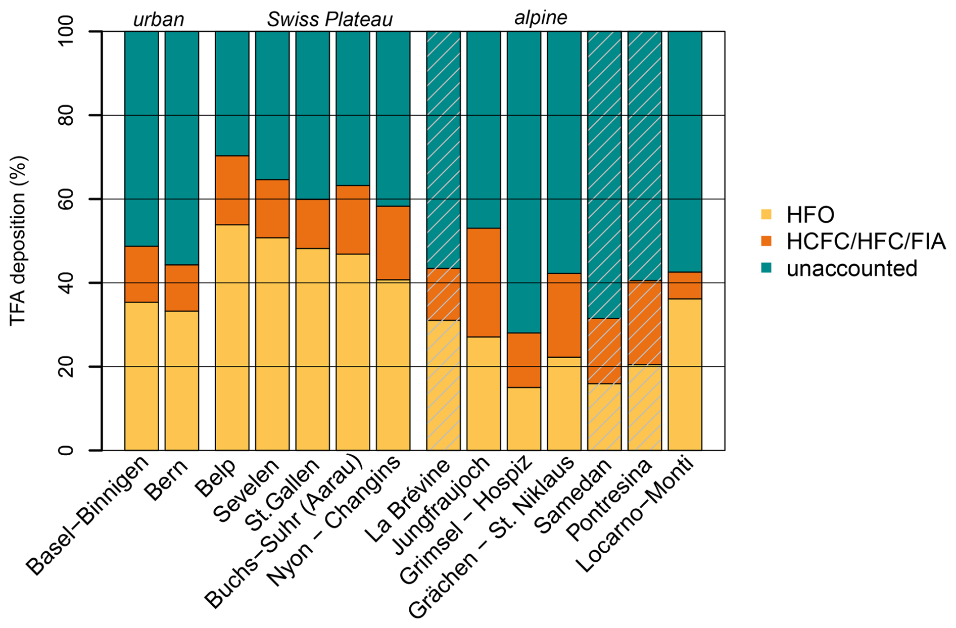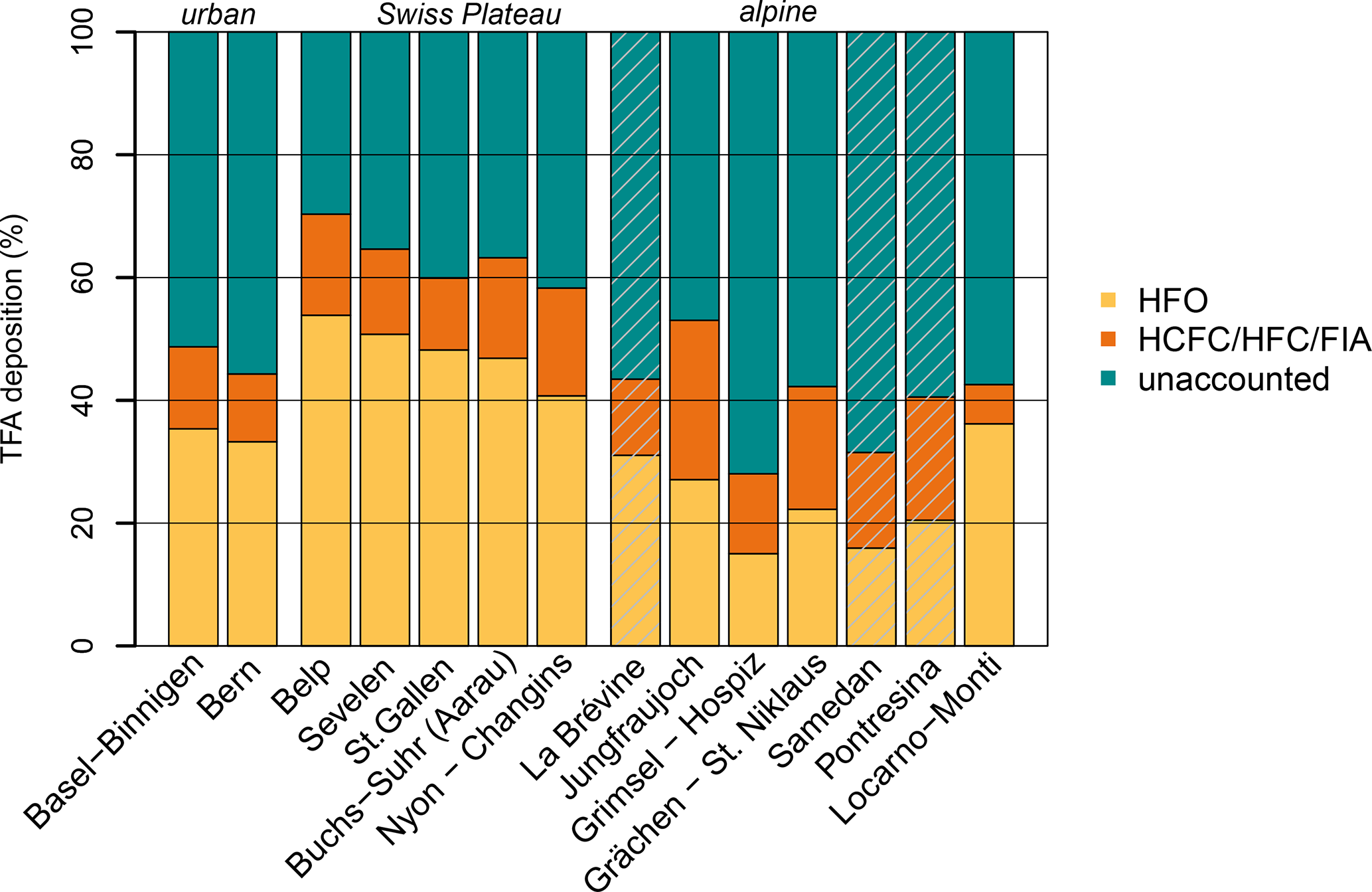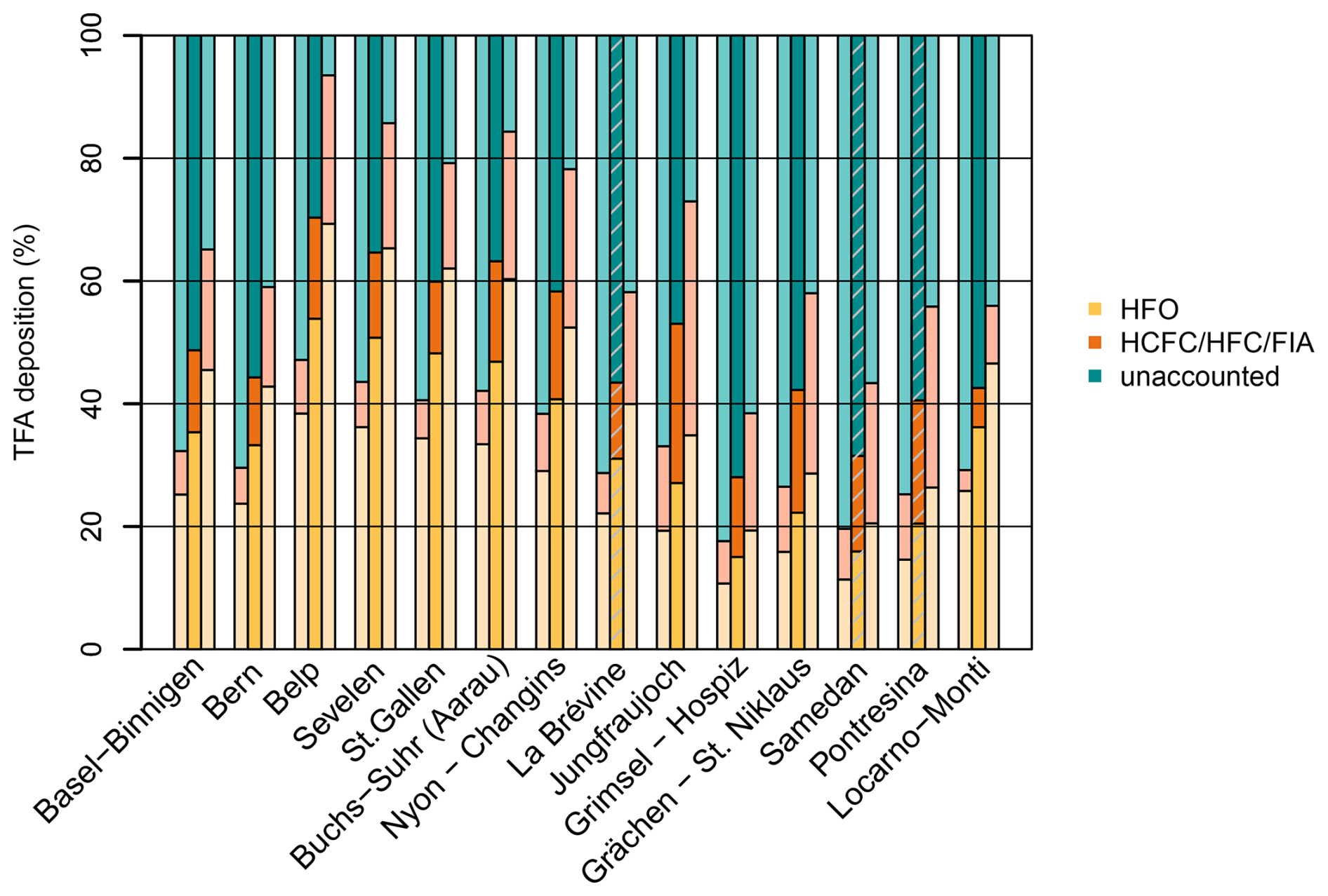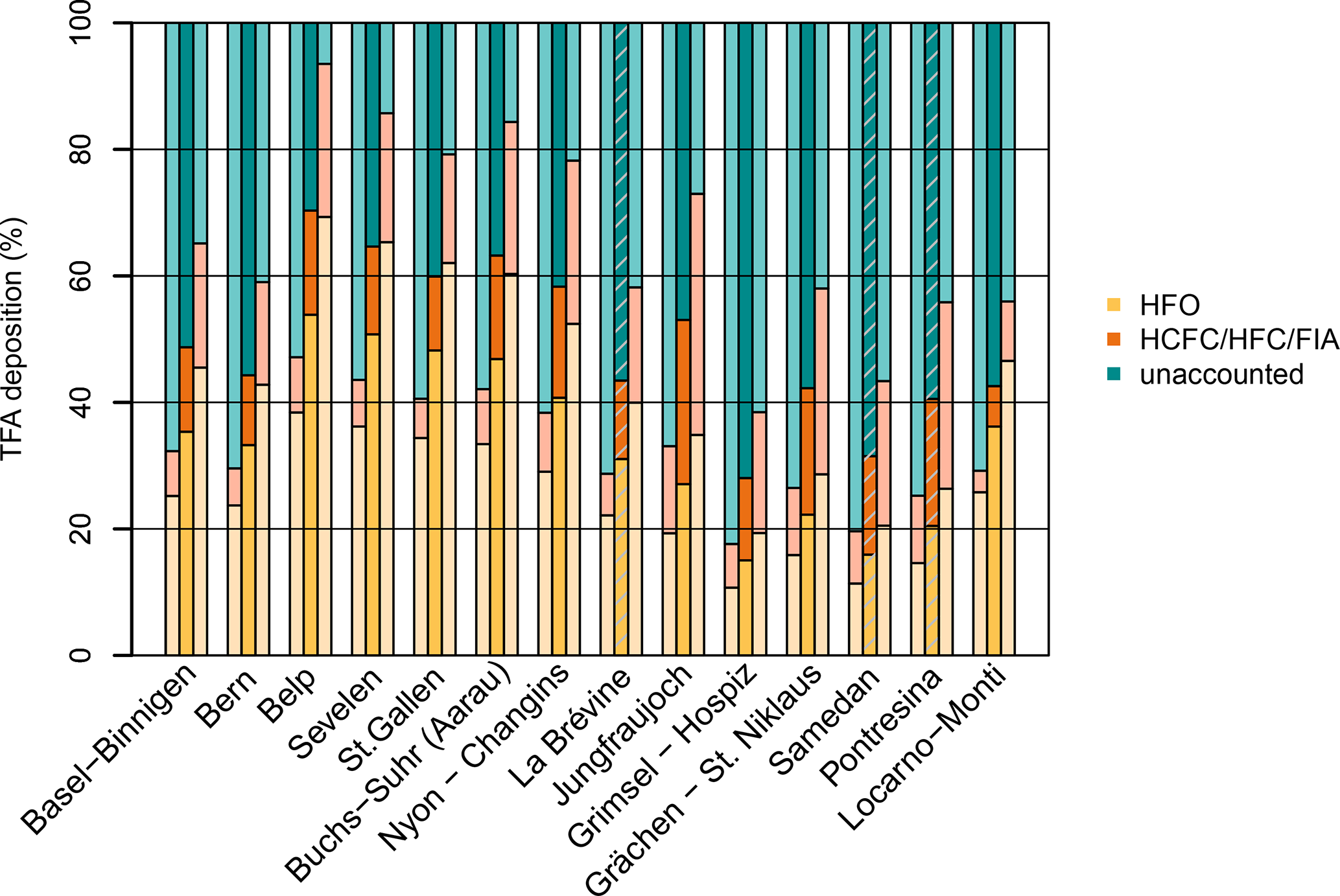 Figure 9Simulated, relative contributions to observed, average TFA deposition at the Swiss monitoring sites for the period 2021 to 2023. Simulated TFA deposition from HFOs (yellow), HCFCs/HFCs/FIAs (orange), and unaccounted fraction (green). Grey shaded bars indicate sites with an incomplete observation coverage (< 90 %). Sites Basel-Binnigen and Bern are urban/suburban locations. Sites Belp to Nyon-Changins are located on the Swiss Plateau. Locarno-Monti is located south of the Alps. All other sites are mountain sites, either with the Alps or the Jura mountains (La Brévine).