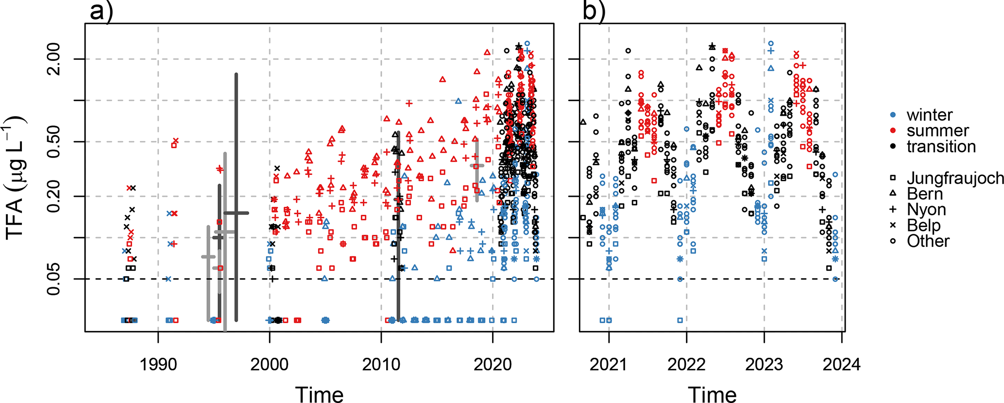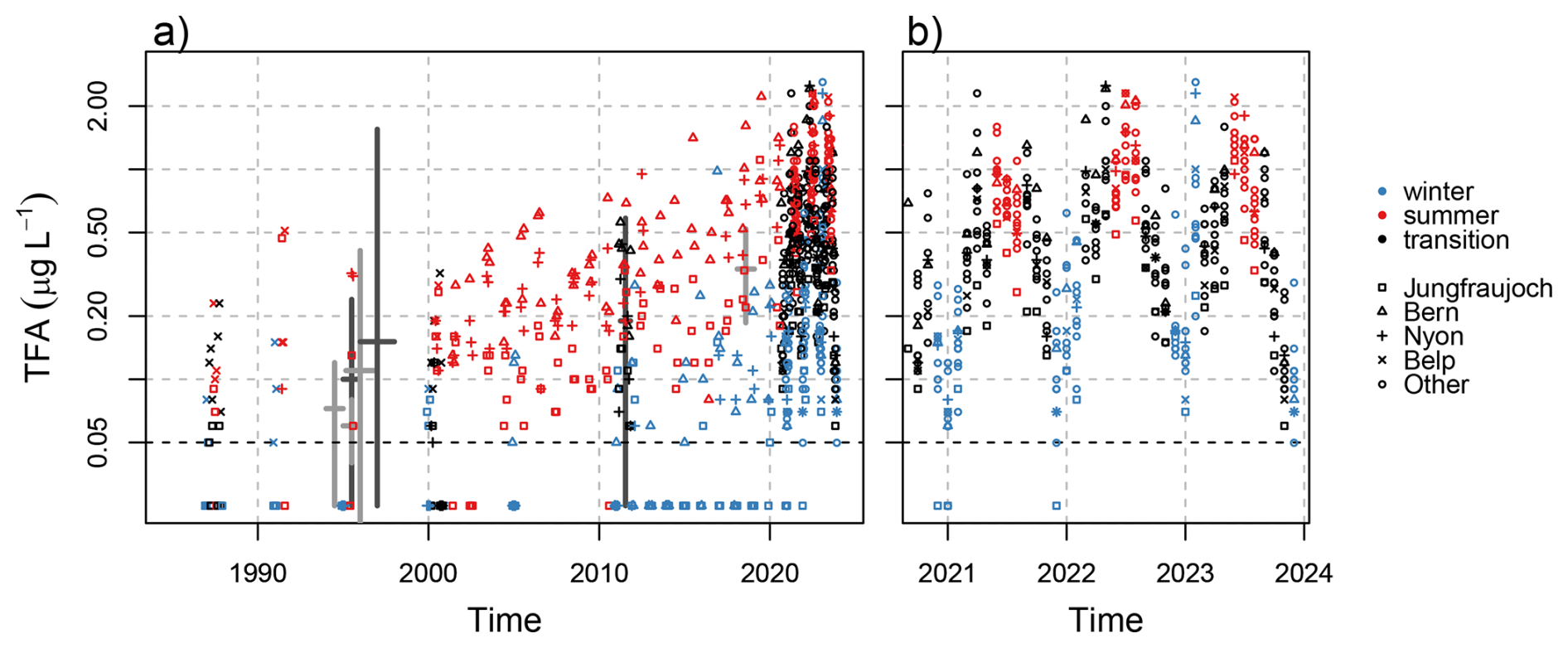 These concentrations can be compared to previously reported TFA concentrations in Switzerland and neighbouring countries. However, earlier reports of TFA concentrations in precipitation often sampled individual rain events and a comparison to monthly mean TFA samples is not straightforward. TFA concentrations in rain samples were analysed by Frank et al. (1995) for samples collected in Bayreuth, Germany, in 1994. Reported concentrations ranged from < 0.003 to 0.12 µg L−1 for 11 individual rain samples. For March to December 1995, the same authors estimated mean TFA concentrations in 34 rain samples of 0.1 µg L−1, with individual samples ranging from 0.03–0.24 µg L−1, for Bayreuth and concentrations in the range of 0.04–0.08 µg L−1 for two locations in Switzerland, Zürich and Alpthal (Frank et al., 1996). Extending this time series to the end of 1996, Jordan and Frank (1999) estimated average TFA concentrations in rainwater in Bayreuth of 0.110 µg L−1 (range 0.01–0.41 µg L−1). Berg et al. (2000) reported mean TFA concentrations in 73 Swiss rainwater samples from 6 locations collected during 1996/1997 of 0.151 µg L−1 (range < 0.003–1.55 µg L−1). Overall and given the different nature of the sampling strategy, these earlier analysis are largely in line with our analysis of archived precipitation samples (compare thick crosses in Fig. 10). Compared to archived samples and previously published observations, current 2021–2023 TFA concentrations have increased about four-fold in the last 25 years. This increase in precipitation is similar to trends (two- to five-fold) in archived plant material from Germany between 1989–2020 (Freeling et al., 2022). Similarly, increasing TFA concentrations in wine have been reported within the last decades (Burtscher-Schaden et al., 2025).