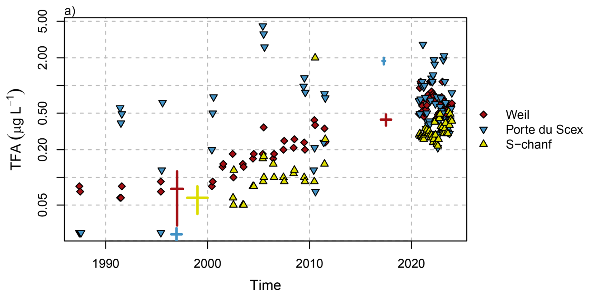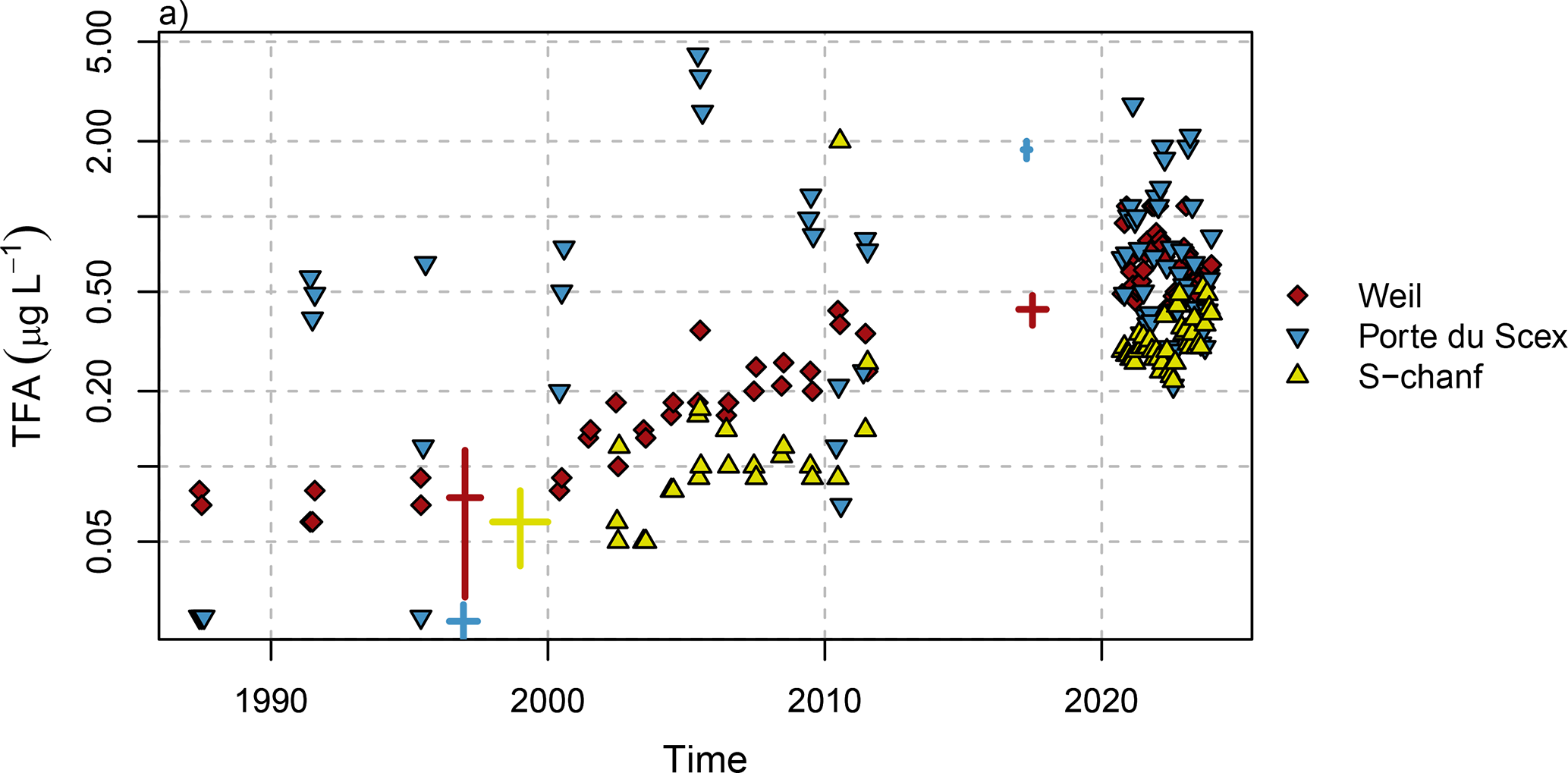 For the period 1987 to 2011, archived river water samples were analysed for three sites: Weil (Rhine), Porte du Scex (Rhone) and S-chanf (Inn) (Fig. 11). Different behaviour was observed for the three rivers. TFA concentrations before 2000 showed rather little variability at Weil with concentrations remaining below 0.1 µg L−1. Since 2000 concentrations rose exponentially (Fig. 11, note logarithmic y-axis). In 2017, Scheurer et al. (2017) reported TFA concentrations in the Rhine in Basel of 0.4 µg L−1, in line with the long-term increase and current (2021–2023) levels of 0.65 µg L−1 (Table 1). Further downstream (Scheurer et al., 2017) observed strongly enhanced TFA concentrations in the Rhine (up to 1.3 µg L−1) and traced these to industrial sources and WWTP discharges. In the Netherlands, TFA is monitored by RIWA at several locations along the Rhine. Annually reported concentrations have largely remained above 1 µg L−1 since 2017, although peak concentrations (as expected from industrial discharges) have decreased in recent years (Fig. 1.18 in RIWA-Rijn, 2024). For Weil previous observations for 1996/1997 with an average TFA concentration of 0.075 µg L−1 were reported (Berg et al., 2000), in close agreement with the archived samples. Similarly but at a lower level, TFA concentrations increased gradually at S-chanf from 2000 onwards. In the upper Bavarian catchment of the river Inn, Christoph (2002) observed 0.04 to 0.08 µg L−1 TFA in 1998/99. Again, this is in agreement with results from archived samples from S-chanf taken in 2002.