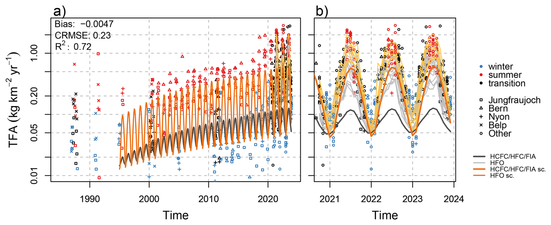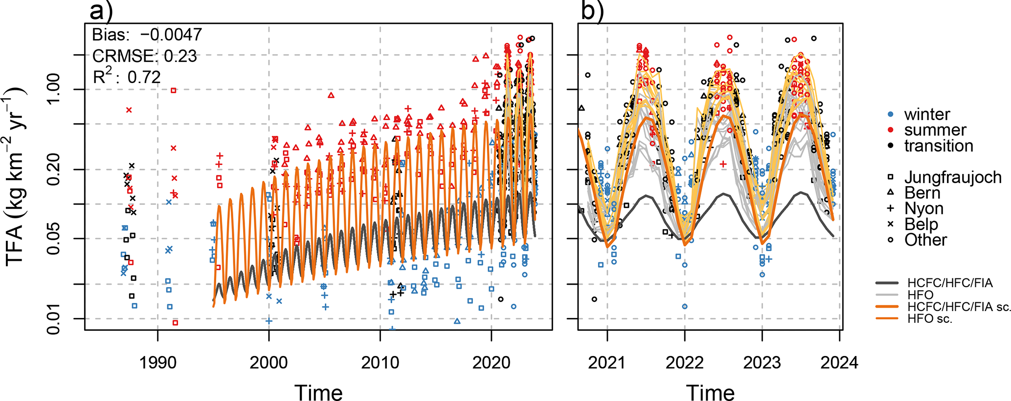 The detailed simulations of HFO-1234yf degradation can be evaluated both against atmospheric concentration observations of HFO-1234yf itself and against TFA in precipitation. With respect to the first, a reasonable model performance was achieved in terms of temporal correlation, peak magnitude and bias, as demonstrated for the observations at the Swiss AGAGE site Jungfraujoch (Fig. 5). The model seems to underestimate summertime mole fractions as seen especially in summer 2022 and 2023, which may have to do with an insufficient representation of vertical mixing in Alpine terrain during convective conditions. Model performance for HFO-1234yf was similar for the observations performed during a seven month campaign on the Swiss Plateau, Sottens, in 2021 (Rust et al., 2023). Satisfactory results were also obtained for Monte Cimone and the two AGAGE sites on the British Isles (Mace Head and Tacolneston, see Fig. B2). However, at Mace Head on the Irish West coast and during winter, the simulation underestimated HFO-1234yf levels, which we attribute to HFO transport from North America, not covered by the simulation. Nevertheless, the good agreement of simulated HFO-1234yf in the Swiss domain confirms the general suitability of the model approach.