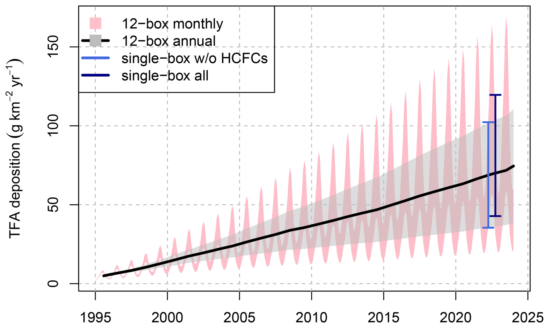 Two different approaches were used to estimate TFA production/deposition from long-lived precursor compounds, a single-box model, which provided a single TFA production rate representative for the years 2021–2023, and a 12-box model, which provided monthly TFA production rates for the period 1995–2023. Both approaches assume that hemispheric TFA production/deposition rates are representative for northern mid latitudes. Applying the single box model, we obtain an average deposition rate of 81 for the years 2021–2023. This value is larger than the 62 published in Behringer et al. (2021), using the same approach, for the years 2018 due to continued increases in the most relevant HFCs and HCFCs and because a more complete set of compounds was considered here. The by far largest contributor to TFA formation was HFC-134a with 49 , which is equivalent to 60 % of the total from all considered HCFCs, HFCs, and FIAs.