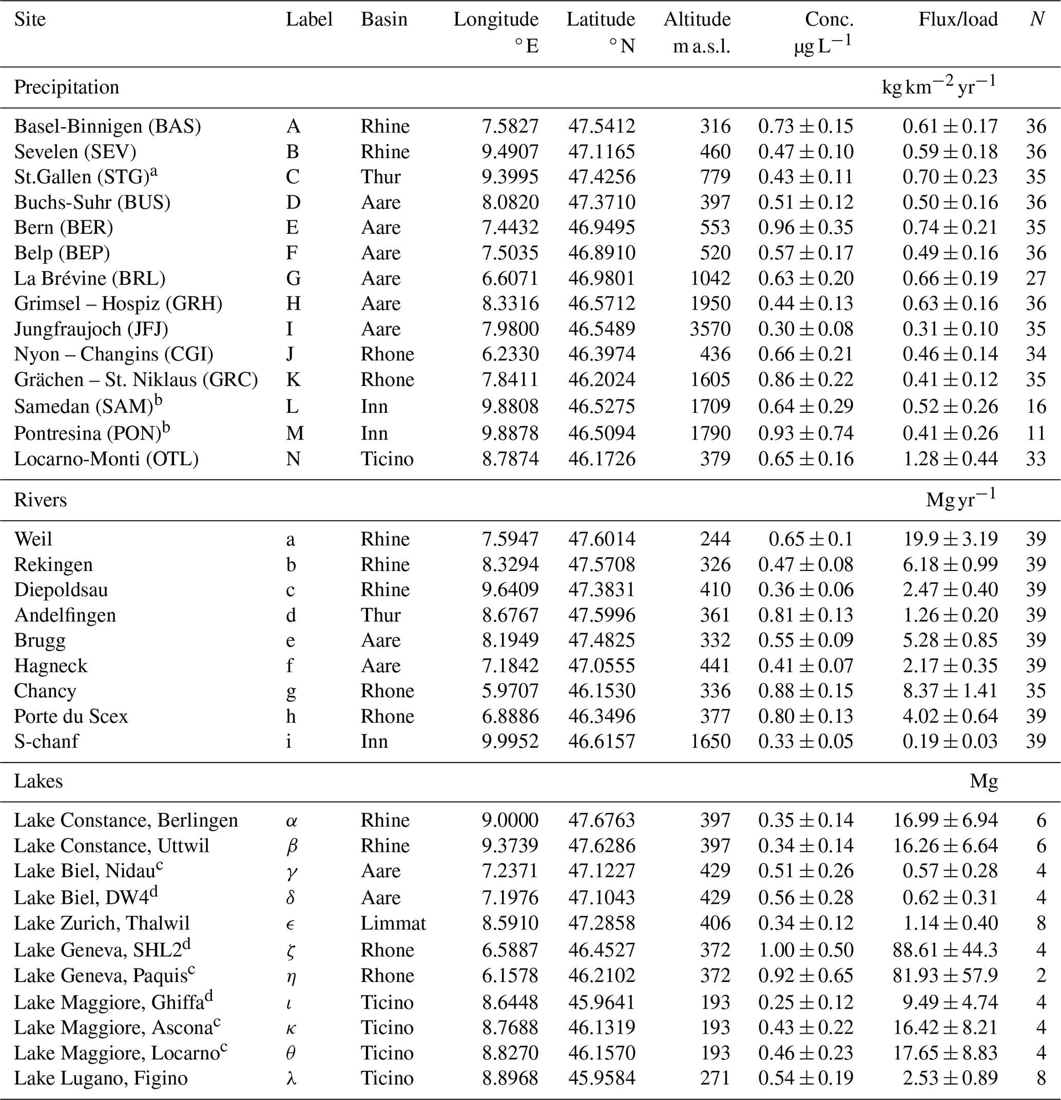 Table 1List of observational sites in Switzerland. Observed TFA concentrations are given as the mean and standard deviation (1σ) for N samples in the the period 2021–2023. Deposition flux, river load and pooled TFA in lakes, were derived by multiplication with precipitation rates, flow rates, and lake volumes, respectively. Sites were associated with major Swiss river basins. The rivers Aare, Limmat and Thur all empty into the Rhine prior to the Rhine exiting Switzerland at Weil. Lake samples where taken both at surface and bottom of the lake, if not otherwise stated. Labels as used in Fig. 1.