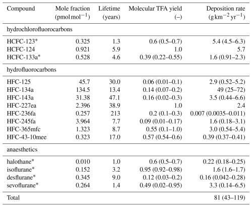 Table 2HFCs, HCFCs, FIAs considered for calculation of TFA formation/deposition. Average mole fractions as observed at the AGAGE site Jungfraujoch, Switzerland, during background conditions in 2021–2023, except for HCFC-123, which was taken from observations from the NOAA flask network (Montzka et al., 2018) (Isacc Vimont, NOAA, personal communication, 2024). TFA yields are taken from (Madronich et al., 2023) and references therein. Mean (2021–2023) deposition rates are taken from the 12-box model, if not stated otherwise, and calculated with mean, minimal, and maximal TFA yields and represent average northern hemispheric conditions.