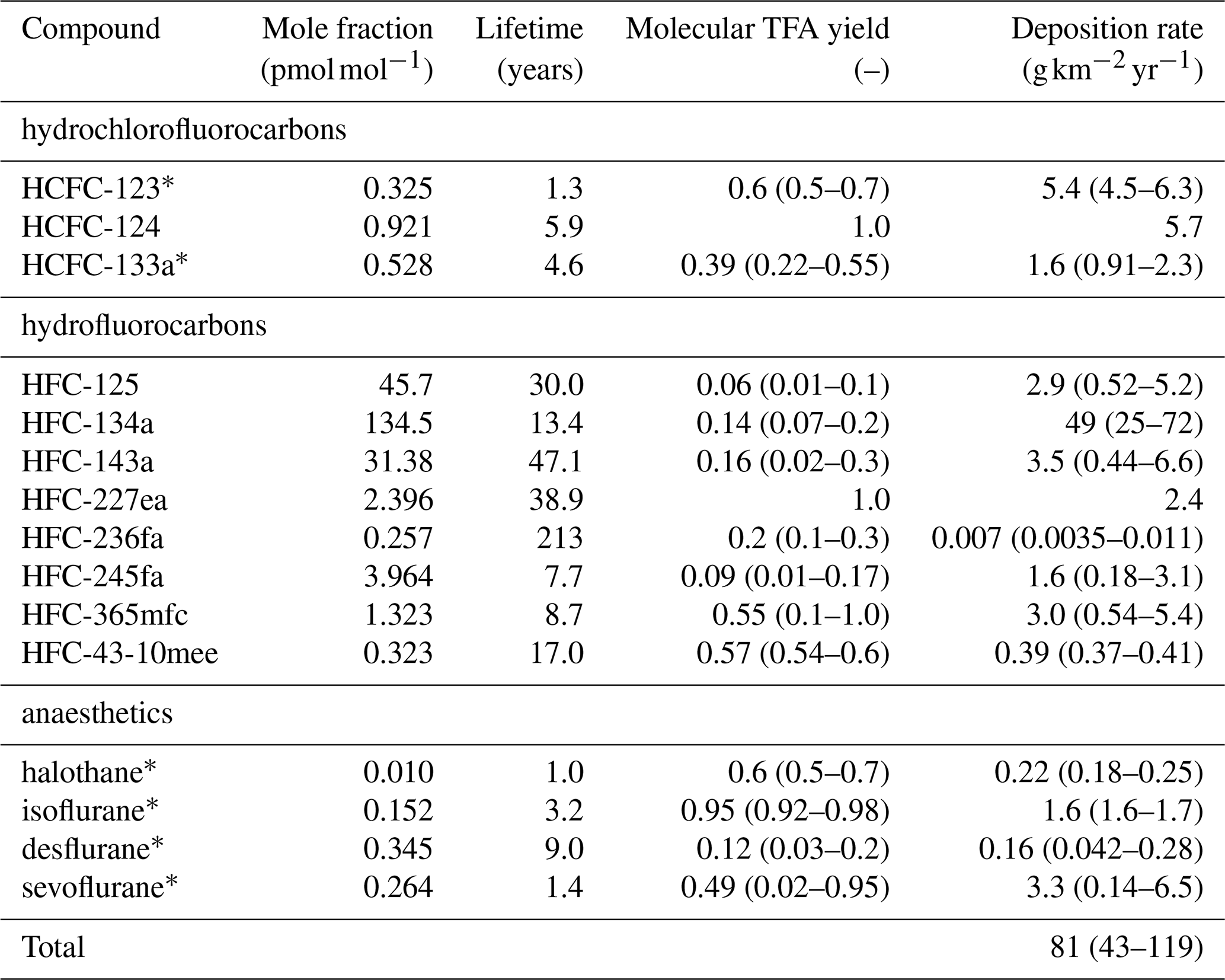 Both calculations assume that the main loss of HCFCs, HFCs, and FIAs is through reaction with OH. After the initial reaction with OH a constant molecular yield to TFA was assumed for each compound (Table 2). In both approaches, it is assumed that TFA deposits close to where it was formed in the atmosphere, such that molecular loss rates per surface area multiplied by molecular TFA yields directly provide molecular TFA deposition rates. Given the relatively homogeneous atmospheric distributions of the precursor gases this assumption should give a good first order estimate of average hemispheric deposition rates. This expectation is in line with previous model studies of HCFC/HFC degradation, which suggest relatively homogeneous TFA spatial distributions (Kanakidou et al., 1995; Kotamarthi et al., 1998; Holland et al., 2021). Spatial differences may occur due to variability in OH and precipitation distributions.