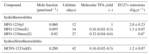Table 3HFOs/HCFOs considered for calculation of TFA formation/deposition. Background mole fractions as observed at AGAGE site Jungfraujoch, Switzerland. TFA yields are taken from (Madronich et al., 2023) and references therein. EU27+ emission estimates are taken from inverse modelling for the years 2021–2023 and using the ELRIS inversion system (Vollmer et al., 2025), if not stated otherwise.