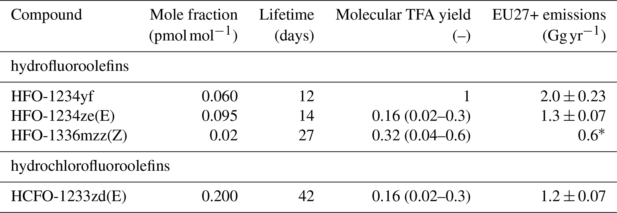 HFOs/HCFOs other than HFO-1234yf that are already marketed at considerable amounts and detectable in the atmosphere are HFO-1234ze(E), HCFO-1233zd(E) (Vollmer et al., 2015), and HFO-1336mzz(Z) (Rust et al., 2023). HFO-1234ze(E) has a similar atmospheric lifetime as HFO-1234yf (approximately 19 vs. 12 d). Therefore, and assuming a similar European source distribution, the TFA deposition distribution resulting from HFO-1234ze(E) is expected to be similar to that of HFO-1234yf. However, the molecular TFA yield from HFO-1234ze(E) is expected to be considerably smaller than for HFO-1234yf, 2 %–30 % (Madronich et al., 2023). At the same time, current (2021-2023) European emissions of HFO-1234ze(E) are about a factor of two smaller than those of HFO-1234yf (see Table 3). Hence, an additional TFA contribution from HFO-1234ze(E) in the order of 1 %–15 % of that of HFO-1234yf can be expected. The atmospheric lifetime of HFO-1336mzz(Z) is more than twice that of HFO-1234yf. Hence, resulting TFA production and deposition is expected to be more dispersed. No European scale emission estimate of HFO-1336mzz(Z) is available. Comparing the emission estimate in Rust et al. (2023) for the Netherlands with a Dutch HFO-1234yf estimation (Vollmer et al., 2025), 30 vs. 120 Mg yr−1, we assume European emissions of HFO-1336mzz(Z) to be four times smaller (mass basis) than HFO-1234yf. Considering a molecular TFA yield of 4 %–60 % (Madronich et al., 2023), an upper range of TFA deposition from HFO-1336mzz(Z) can be expected in the order of 1 %–15 % of that of HFO-1234yf. HCFO-1233zd(E) has an atmospheric lifetime of 42 d and an estimated molecular TFA yield of 2 %–30 % (Madronich et al., 2023). With European mass emissions being about a factor of two smaller than those of HFO-1234yf (Table 3) associated TFA deposition is expected in the range of 1 %–15 % of that of HFO-1234yf. Overall, TFA deposition from these compounds can be expected to add about 24 % to that of HFO-1234yf, with this value being the mean considering the literature on TFA yields (minimum–maximum: 3 %–45 %). In all estimates of TFA depostion from HFO-1234yf, we add these 24 % to account for other HFOs in use, well knowing that due to different atmospheric lifetimes the relationship between emissions and TFA deposition will not be fully linear everywhere.