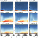 Figure 3Diurnal variation of pollutants at FK. Time series of daily (a) aerosol, (b) NO2, (c) HCHO and (d) CHOCHO surface mixing ratios and vertical column densities from MAX-DOAS measurements in Hainan Island, China.