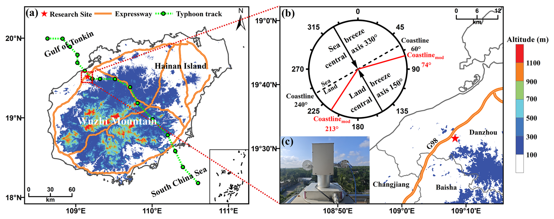 Figure 1Overview of the study area and MAX-DOAS. (a) Topographic map of the area around the geopotential height and Multi-Axis Differential Optical Absorption Spectroscopy (MAX-DOAS) measurement station (19.53° N, 109.14° E) in Hainan Province, marked by a red five-pointed star, and the highway network is indicated by an orange line. The track of the typhoon “Prapiroon” is shown by the green dotted line; (b) Topographic map of the area around the observation site, where a highway (G98) passes about 1600 m to the northwest of the observation site. Compass charts for recording the direction of the sea breezes (SB) and land breezes (LB) are given in the upper left. The central axes of the SB and LB directions are shown by black arrows, and the red solid lines represent the modified coastline (Coastlinemod); and (c) MAX-DOAS instrument.