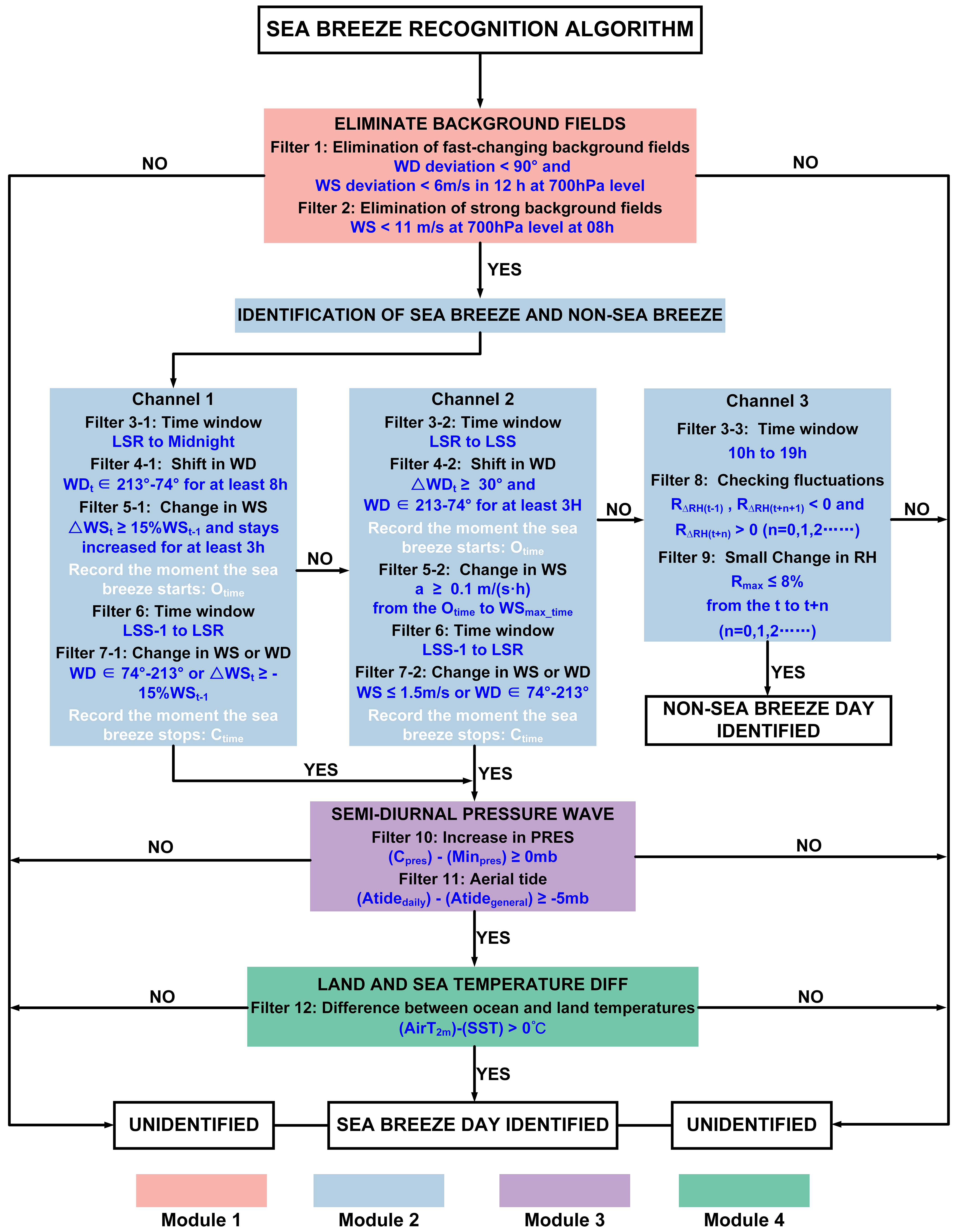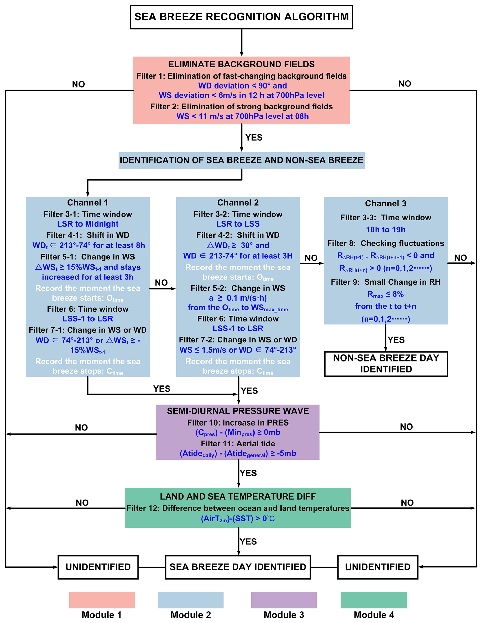 Figure 2 illustrates the flow of an objective recognition algorithm (ORA) for SLB containing four modules and 12 filters. Unless otherwise noted, the data used by ORA are near-surface data. Module 1 filters the large-scale circulation background unfavorable to the formation of SLB, one of the important factors influencing the formation of SLB, through the wind speed (WS) and WD at high altitude (filters 1 to 2) (Arrillaga et al., 2020). Module 2 is the core module, which contains three channels: channels 1 (filter 3 to 7-1) and 2 (filter 3 to 7-2) are based on the sudden change of WS and WD to identify the SB, and the rate of change of WS is introduced to capture the dynamics of the local wind field (filter 5-2), which can make up for the deficiencies of the traditional WS thresholding method; channel 3 rejects dates potentially affected by oceanic currents by setting a relative humidity (RH) increase threshold (filters 8–9). Module 3 excludes large-scale airflow disturbances through barometric pressure conditions (filters 10–11). Module 4 ensures that the remaining days satisfy the minimum sea-land temperature gradient (filter 12) as a prerequisite for SB establishment. The specific functions of the modules and filters are detailed in Sect. S2 (Supplement) and identification results are summarized in Table S3 and Sect. 3.2.