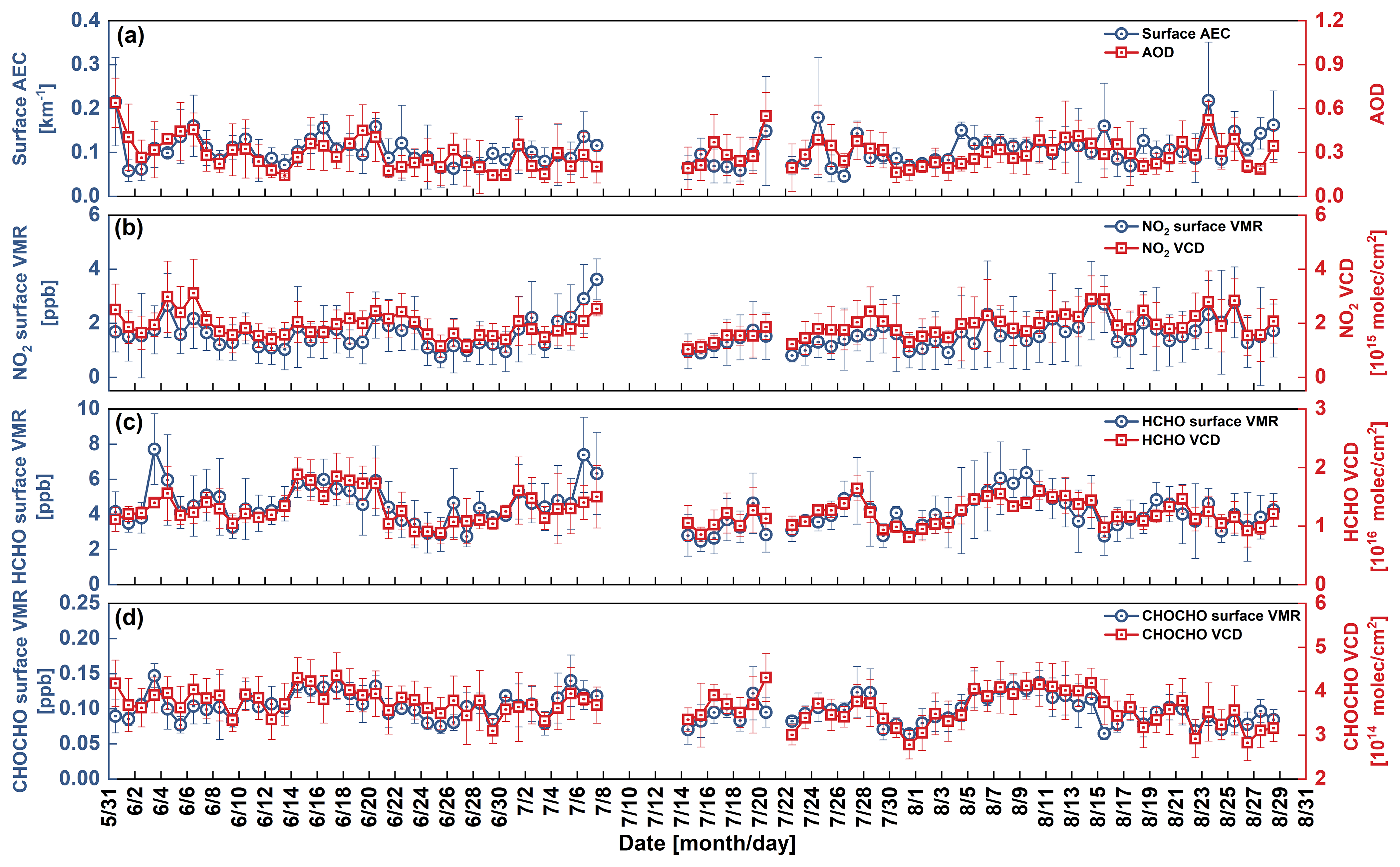 At an hourly temporal resolution (Fig. S6), HCHO and CHOCHO exhibited significant positive correlations with elevated temperatures (> 30 °C) and reduced humidity (< 60 %), particularly during two enhanced photochemical periods: 12–22 June 2024 and 1–23 August 2024, when the elevated concentrations persisted from the surface through elevated atmospheric layers. Surface VMRs and VCDs show relatively similar patterns in their time series for all species because of their predominantly low-level distribution. However, during specific episodes (e.g., 7–10 August 2024), pronounced fluctuations in vertical temperature and humidity profiles resulted in a clear decoupling between surface and column measurements for NO2, HCHO, and CHOCHO, which was more pronounced in aerosols as indicated by the weakest correlation (R2=0.34) between surface AEC and AOD (Fig. S7). These results suggest that the vertical distribution pattern of pollutants may involve more complex physicochemical processes that deserve further investigation.