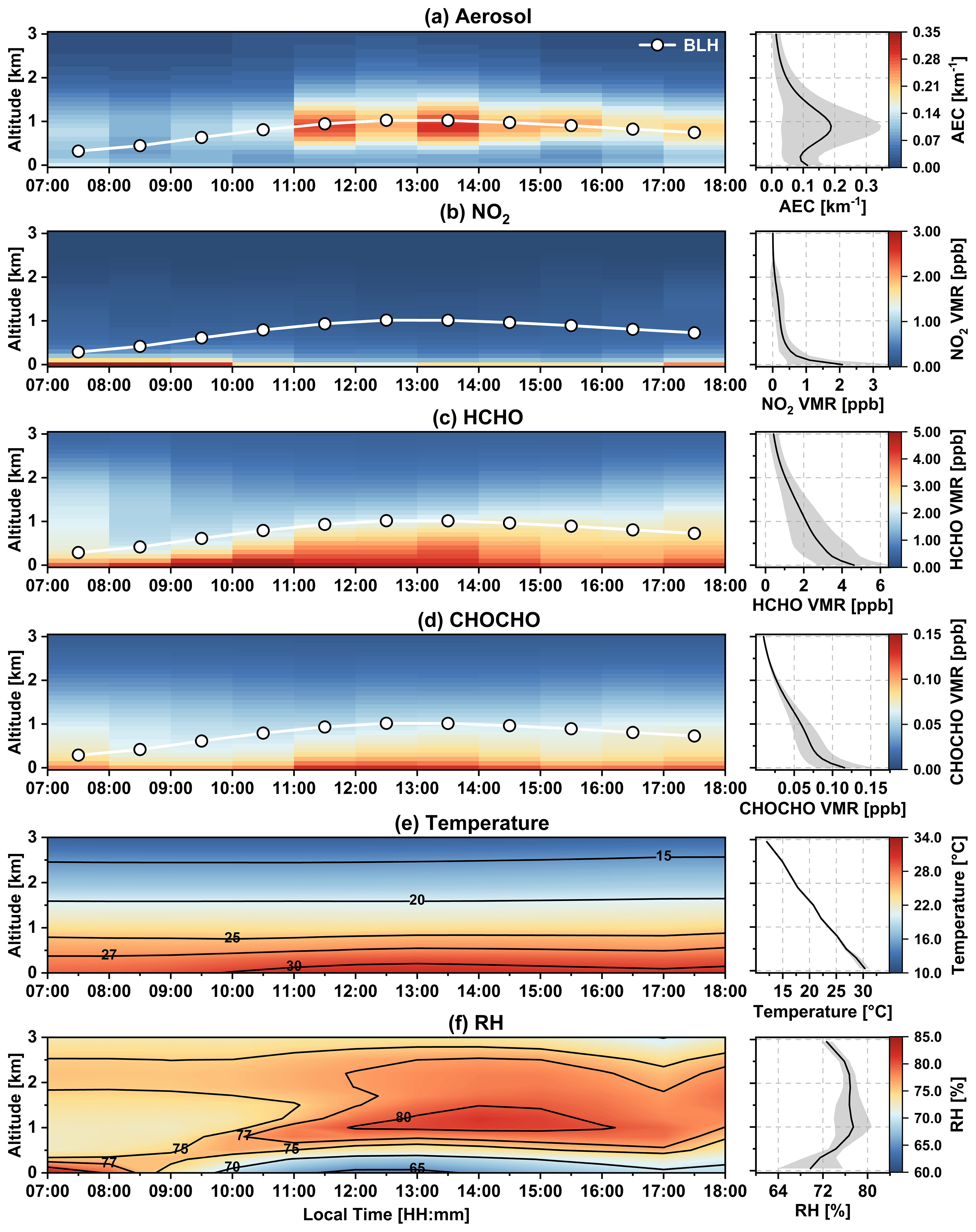 Figure 4Diurnal variations in vertical profiles of pollutants and meteorological factors at FK. (a) AEC, (b) NO2, (c) HCHO, and (d) CHOCHO measured by MAX-DOAS; (e) Temperature and (f) relative humidity (RH) from ERA5 reanalysis. Boundary layer height (BLH) cycles are indicated, while mean vertical profiles displayed in right panels.
