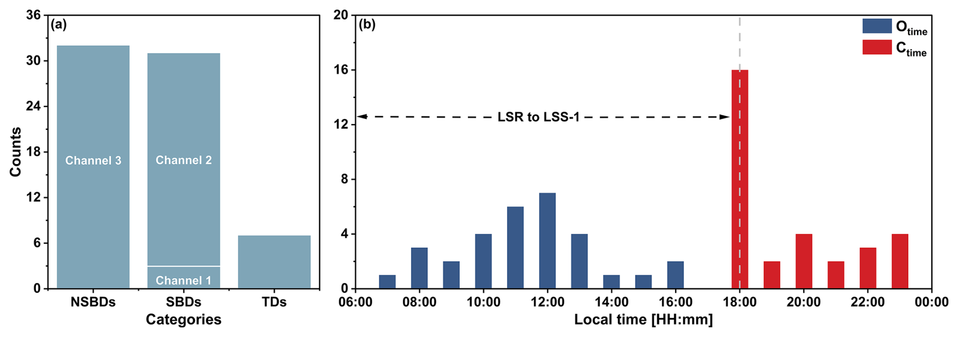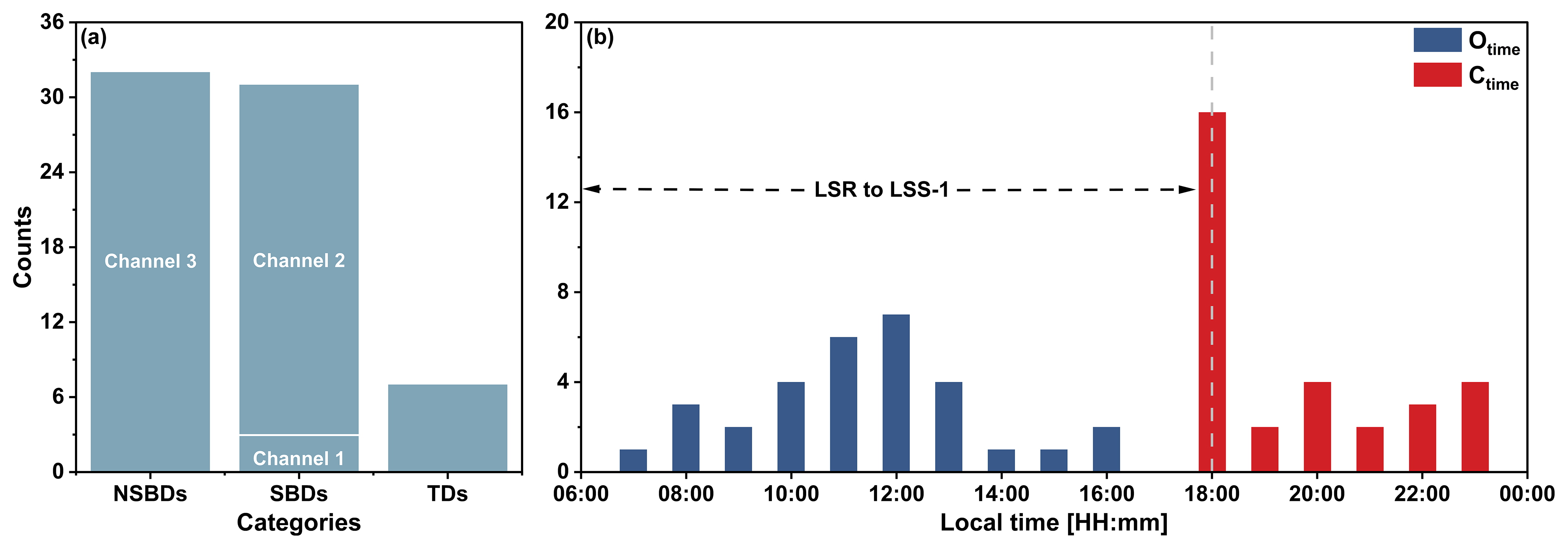 Figure 5Statistics of the results of objective recognition algorithm for different air currents. (a) the frequency of occurrence of NSBDs, SBDs and TDs, as well as (b) the frequency distribution of SB onset and cessation times (Otime and Ctime). The time ranges for local sunrise (LSR) and 1 h before local sunset (LSS) are marked with dotted arrows.