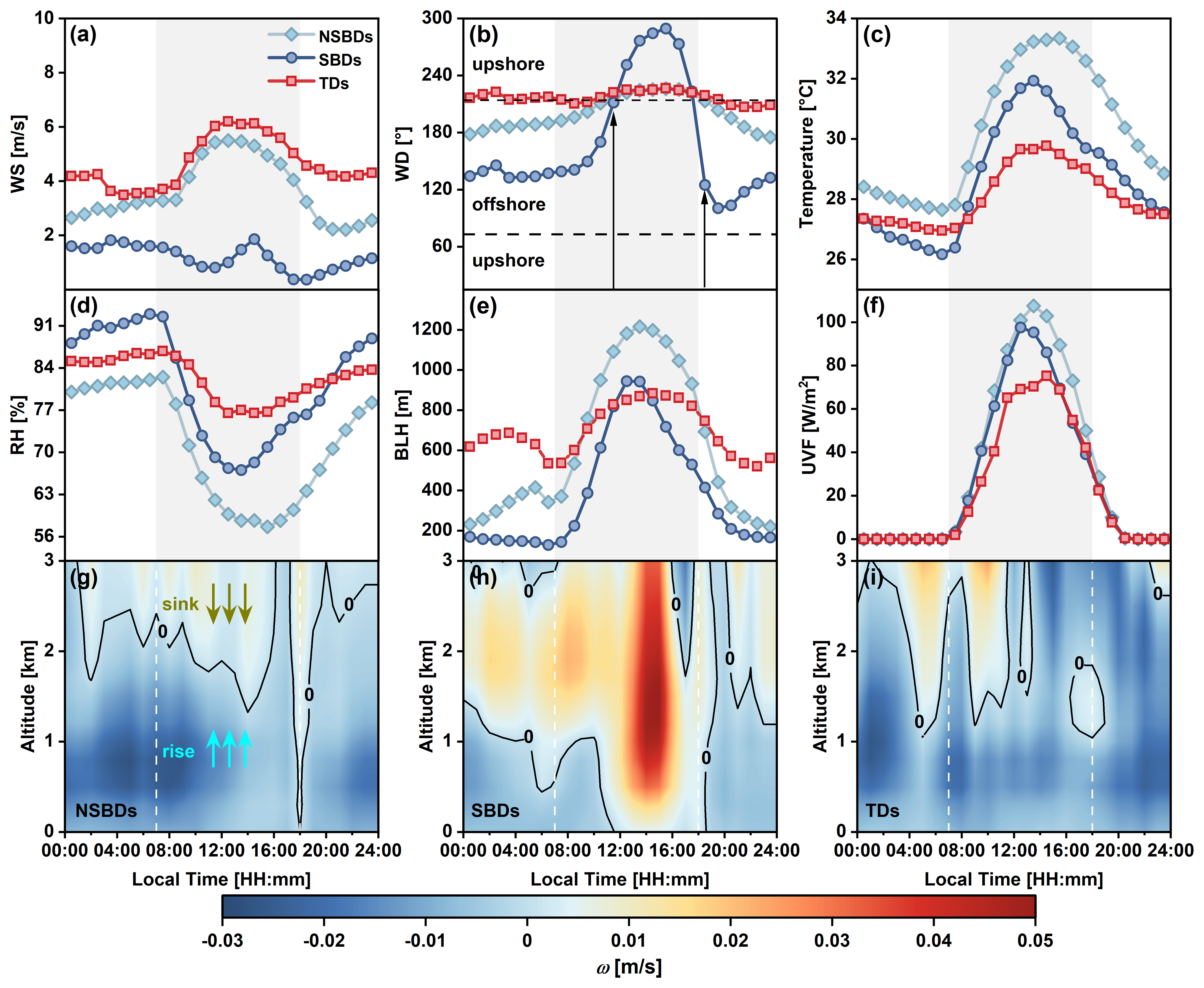 Figure 6Diurnal variations of meteorological factors under different air currents. Mean diurnal variations of (a) WS, (b) WD, (c) temperature, (d) RH, (e) BLH, (f) UV radiation flux (UVF) and (g–i) vertical velocity (ω) under three air current patterns (ACPs): NSBDs, SBDs, and TDs. The gray shaded area represents the observation period of MAX-DOAS. The two black dotted lines define the range of WD for onshore and offshore winds. Critical transition points for SB initiation and cessation are marked with arrows in (b). The blue and brown arrows represent rising and sinking air currents, respectively.