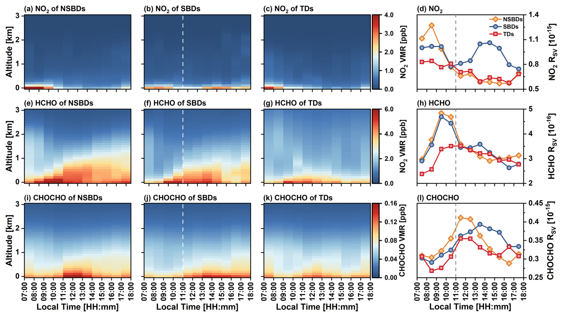 Figure 7Diurnal variations in vertical distributions of pollutants under different air currents. Mean diurnal vertical distribution of (a–c) NO2, (e–g) HCHO, and (i–k) CHOCHO on NSBDs, SBDs, and TDs. Diurnal variations of the ratios of surface VMRs and VCDs (RVS) for (d) NO2, (h) HCHO and (l) CHOCHO are shown in the far right column. The Otime of the SB is indicated in the SBDs and RSV panel by a white dashed line and a grey dotted line, respectively.