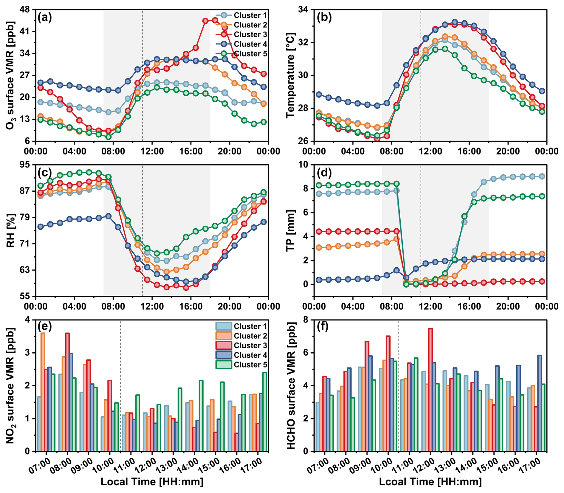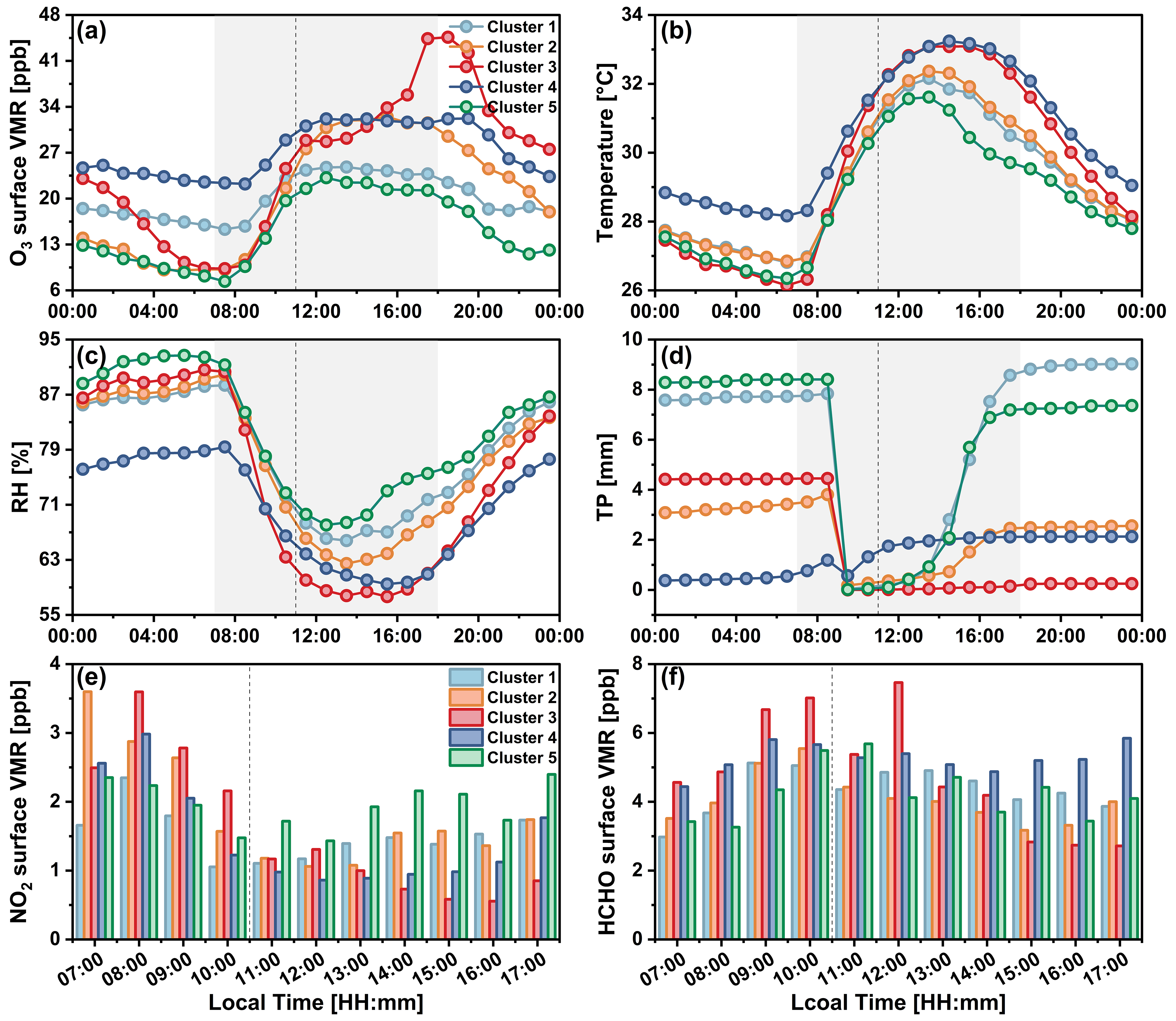 To investigate the influence of different ACPs on summertime O3 concentration and photochemical formation, K-means clustering was to characterize diurnal pattern of O3 concentration (Sect. S3). Figure 8 shows the daily profiles of O3 and its precursors (NO2 and HCHO from MAX-DOAS) and meteorological parameters (temperature, RH and total precipitation (TP)) for the five categories during the observation period. The difference between the midday peak and the morning minimum represents net O3 increment (ΔO3). The statistics on the number of days, background levels, ΔO3, NSBDs and SBDs for each category are shown in Table 1. Five O3 clusters exhibit different concentration characteristics: Cluster 1 (moderate background/low ΔO3), Cluster 2 (low background/high ΔO3), Cluster 3 (low background/extreme ΔO3), Cluster 4 (high background/low ΔO3), and Cluster 5 (low background/moderate-high ΔO3). Moreover, Cluster 1 and Cluster 5 exhibit a high prevalence of SBDs, accounting for 64.7 % and 83.3 %, respectively, while Clusters 3 and 4 are predominantly composed of NSBDs, at 71.4 % and 86.7 %. Cluster 2 shows an equal distribution of 50 % each.