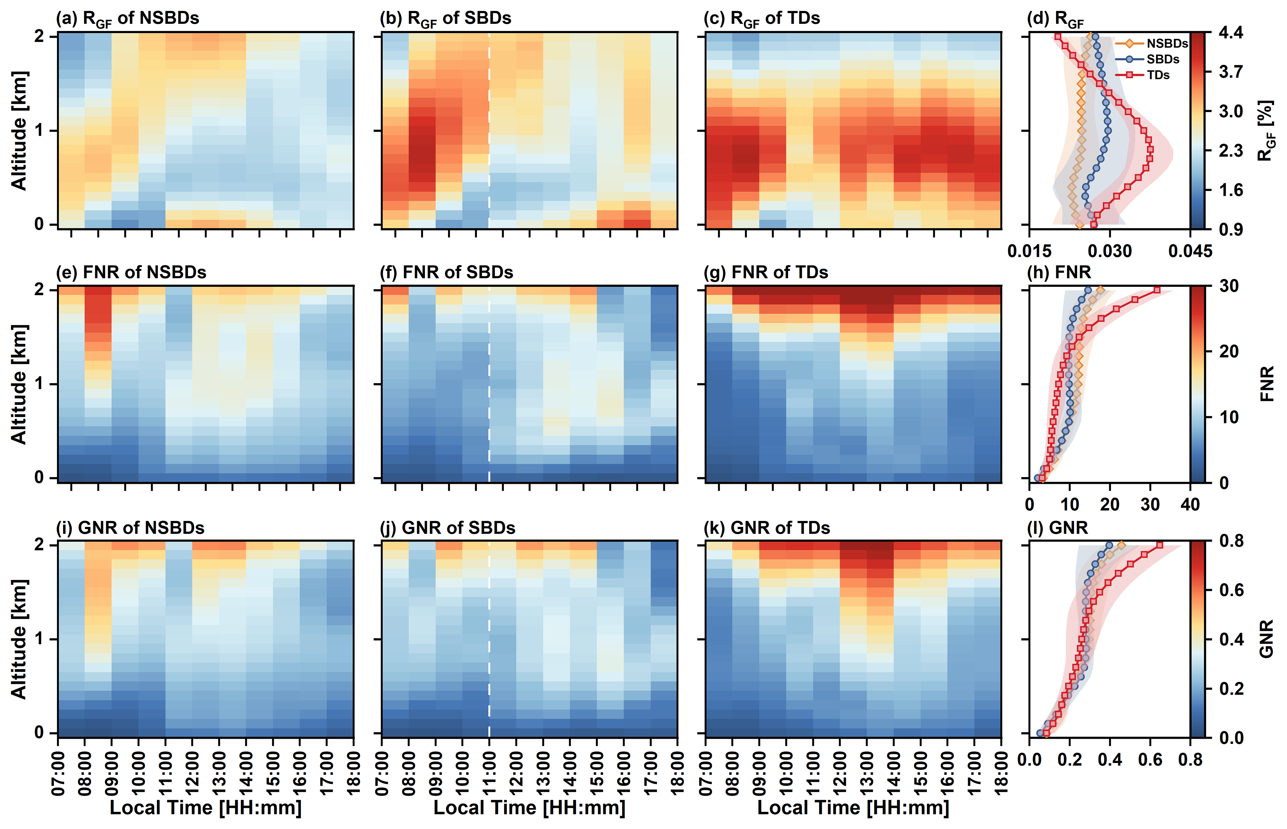 Figure 9Diurnal variations in vertical distributions of photochemical indicators. Mean diurnal cycles in the vertical distribution of (a–c) RGF, (e–g) FNR, and (i–k) GNR on NSBDs, SBDs, and TDs. Vertical profiles of (d) RGF, (h) FNR and (l) GNR are shown on the far right, with the shaded area indicating the standard deviation. The Otime of the SB is indicated by a white dashed line in the SBDs panel.