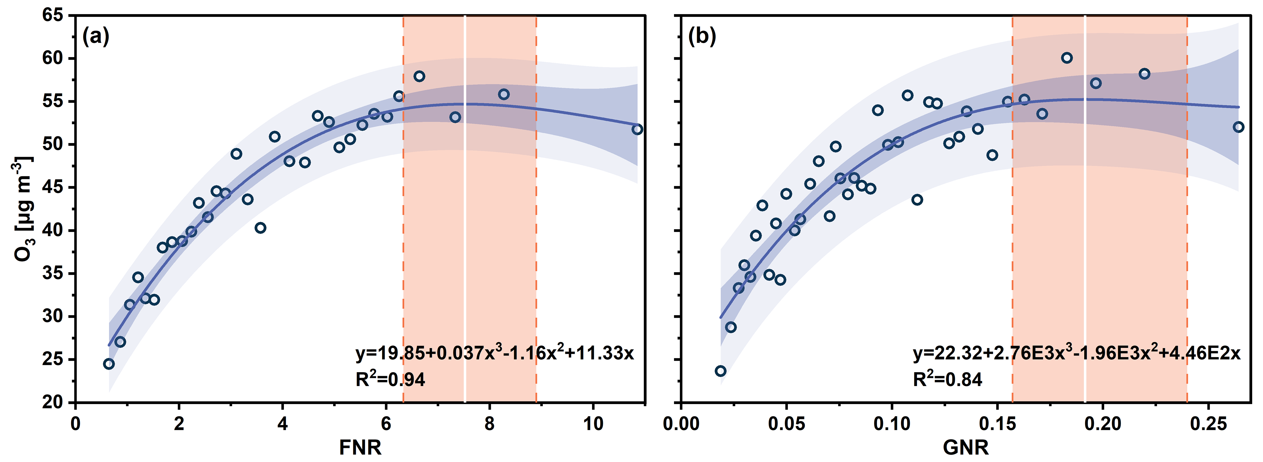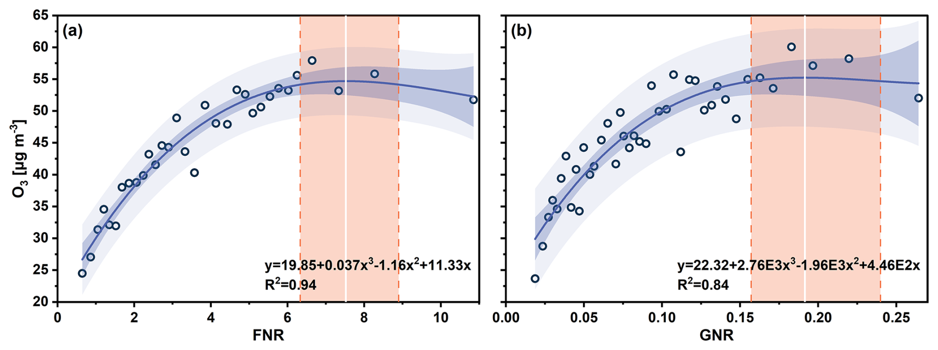 Figure 10Diagnosing the O3 formation sensitivity. The relationship between local O3 surface concentrations and (a) FNR and (b) GNR values was fitted based on MAX-DOAS observations. The blue solid line is the fitted third-order polynomial curve, and the shading indicates the 95 % confidence level and 95 % prediction band, respectively. The white solid line indicates the peak of the fitted curve and the pink vertical shading indicates the range above the top 1 % of the fitted curve (transition regime).
