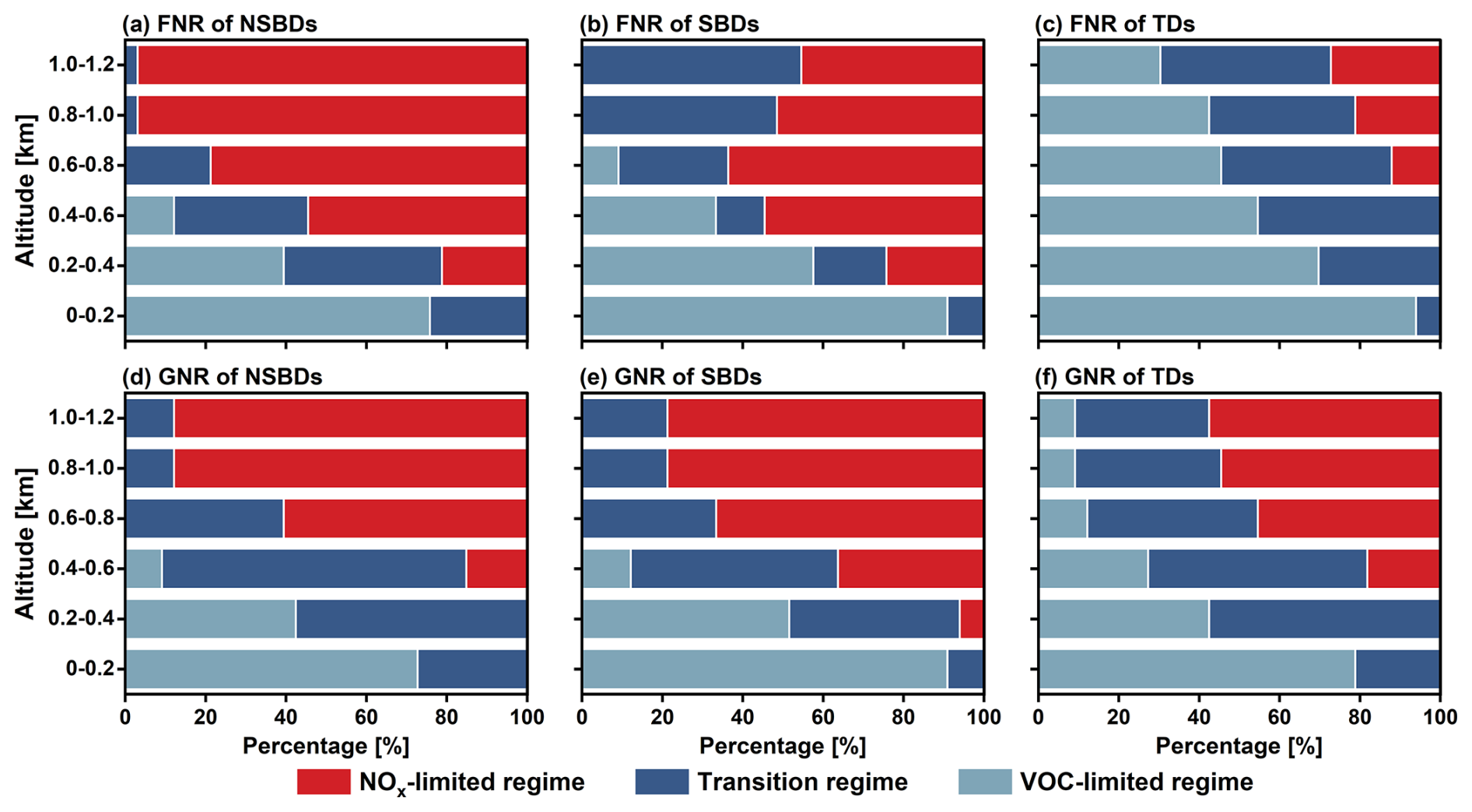 Figure 11Vertical distributions of ozone formation sensitivity under different air currents. The contribution of VOC-limited, transition, and NOx-limited regimes for each layer below 1.2 km on (a, d) NSBDs, (b, e) SBDs and (c, f) TDs at the observation site.