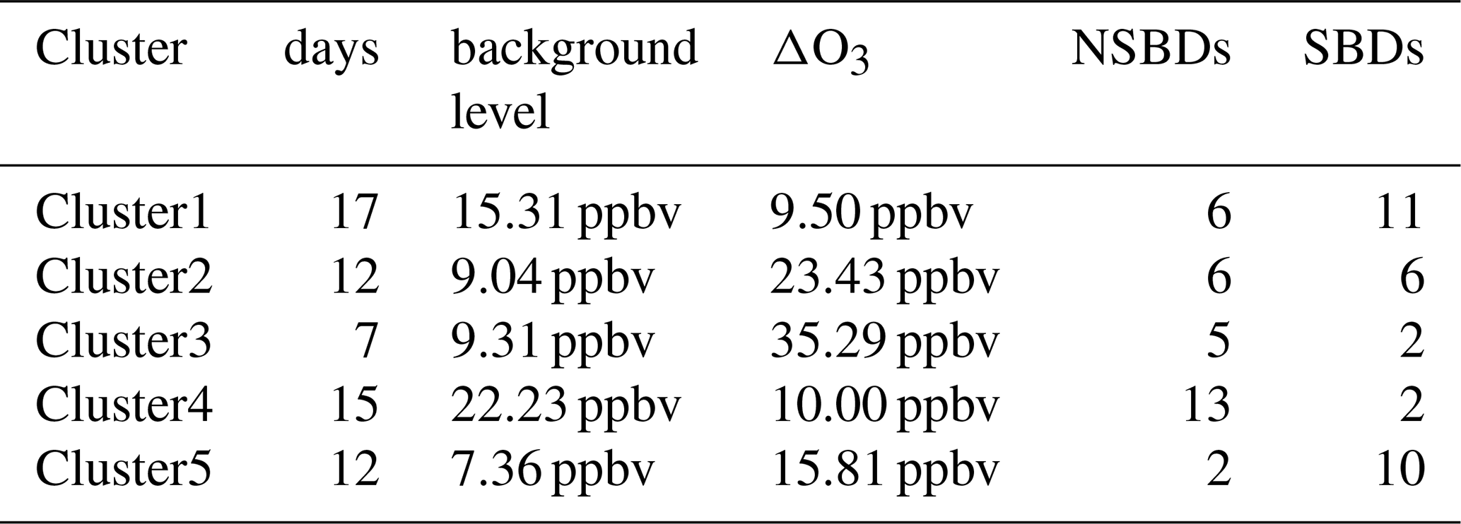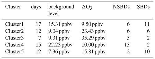 Table 1After dividing the daily O3 changes into five clusters based on the K-means method, the number of days, the O3 background level, the net O3 increment (ΔO3), and the number of NSBDs and SBDs for each cluster are as follows.