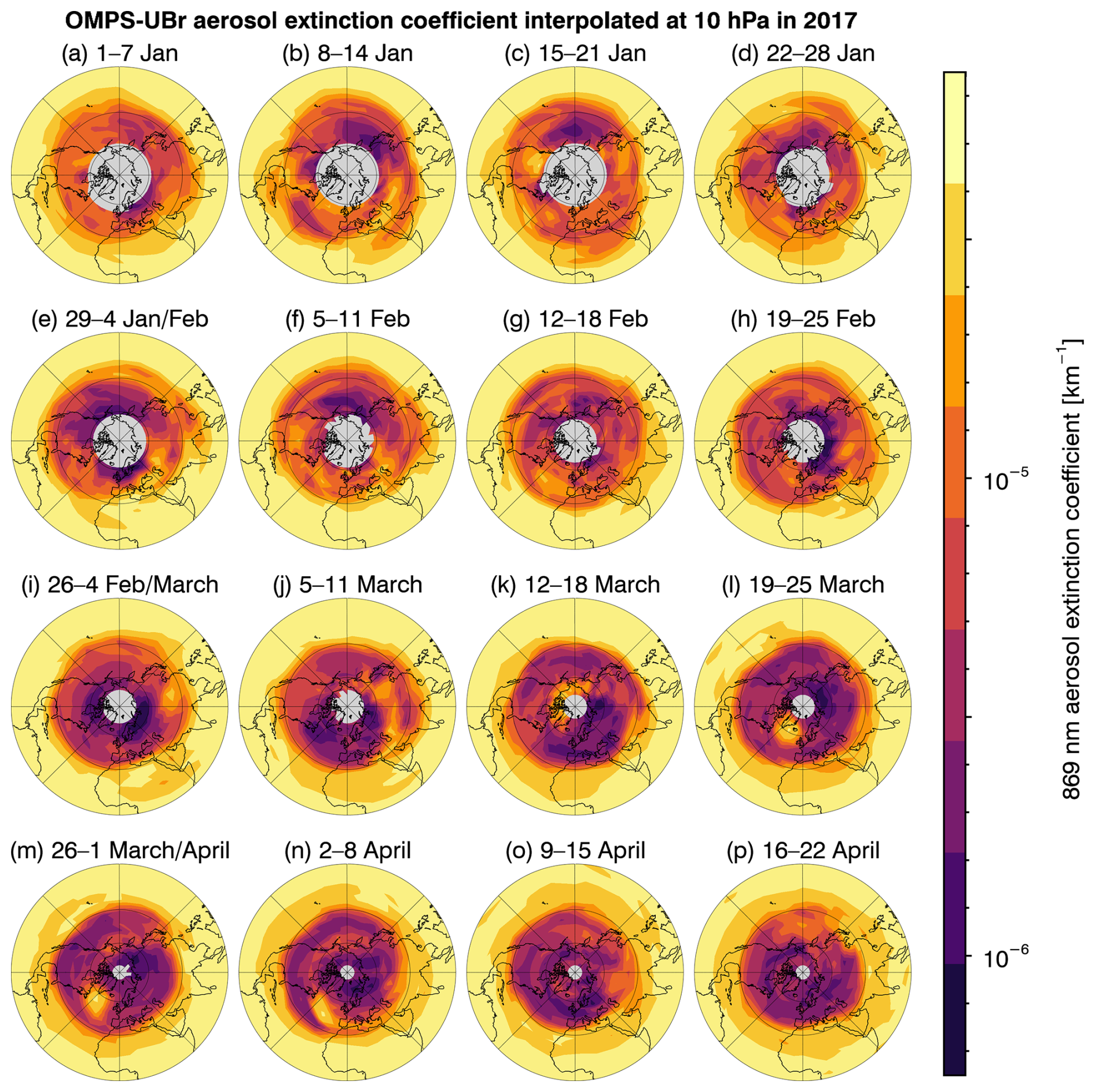 Figure 3 shows the development of the weekly averaged extinction coefficient interpolated to 10 hPa, i.e. approximately 30 km altitude for the initial 16 weeks of 2017. The figure shows the aerosol extinction coefficient at 869 nm in bins of 5° latitude and 15° longitude in the Northern Hemisphere.
