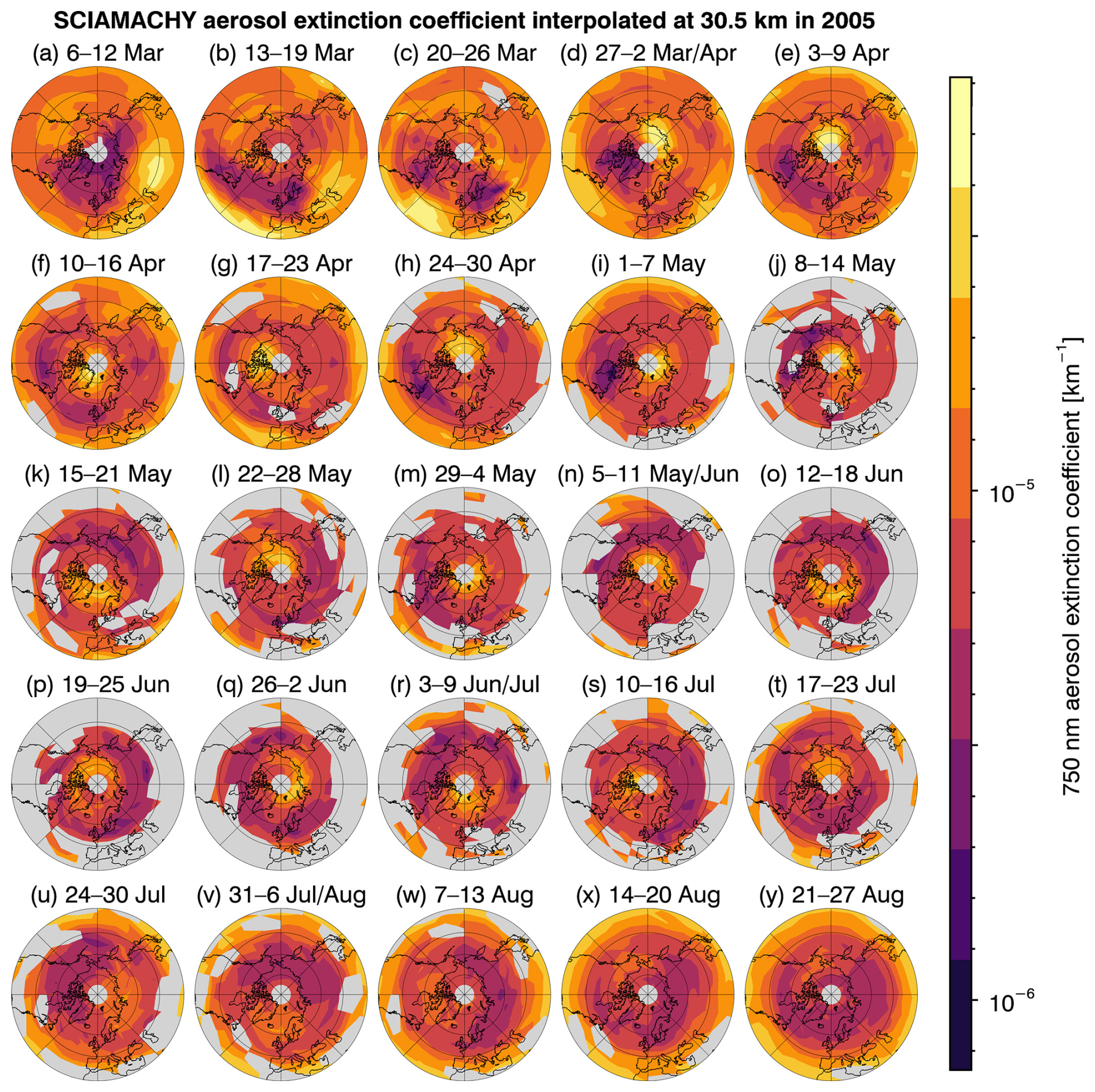 Manney et al. (2006) observed a strong and long-lasting FrIAC in 2005. This subsection will examine whether this can also be observed in the aerosol extinction coefficient. A notable peak in the aerosol extinction coefficient in the mid-stratosphere during the SCIAMACHY measurement period was observed in spring 2005. Figure 7 shows the aerosol extinction coefficient at 750 nm in the Northern Hemisphere interpolated at an altitude of 30.5 km from spring to late-summer 2005. The northern winter of 2004/05 was relatively cold with prolonged periods of temperatures below 200 K in the lower stratosphere and characterized by a strong and stable polar vortex (e.g. Sonkaew et al.2013). On 13 March, there was an exceptionally early final warming, approximately one month before the historical median (Butler and Domeisen2021). As can be seen in Fig. 7a–d, there are some variations in March 2005 in the mid-latitudes. From the end of March/beginning of April an increase in the aerosol extinction coefficient at the pole is noticeable.