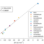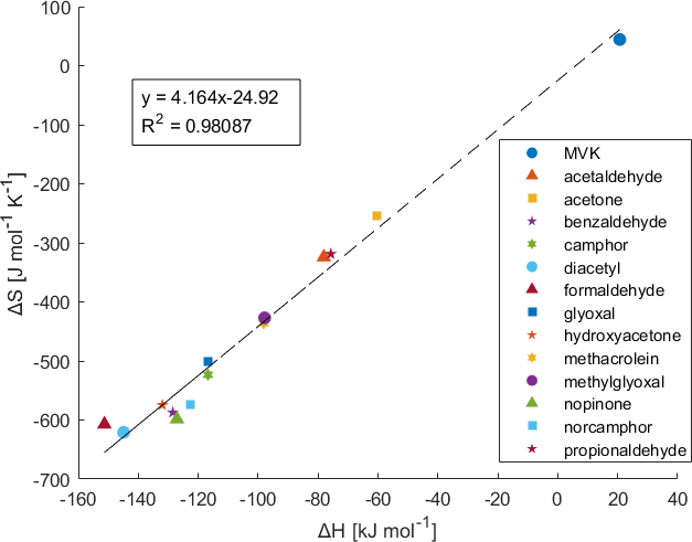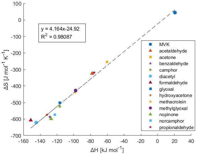Plotting the calculated ΔH and ΔS, as seen in Fig. 3, demonstrates an apparent entropy-enthalpy compensation (EEC) effect, where ΔH scales proportionately with ΔS. This relationship appears to also extend to the calculated ΔH and ΔS for MVK. This form of linear correlation between ΔS and ΔH, where it arises for a series of homologous compounds employed in a process, is referred to as the strong form of EEC (Sharp, 2001). This compensation effect appears to have good linearity with an r2 of 0.9809 with no noticeable outliers with a compensation temperature (i.e. slope; Tc ) of 235.5 K. EEC however has been known to arise as a statistical artefact with high r2 and is often controversial (Grunwald and Steel, 1995; Krug et al., 1976; Leffler, 1955; Leung et al., 2008; Liu and Guo, 2001; Moulik et al., 2019; Pan et al., 2015; Sharp, 2001). This is because methods such as van't Hoff analysis are indirect and do not measure ΔH and ΔS independently. Thus, for measurements on a limited temperature range, true observation of ΔH and ΔS can be obscured by trivial correlation arising from larger errors in determining ΔH than ΔG rather than some extra-thermodynamic mechanism of EEC (Sharp, 2001). Additionally, van't Hoff analysis assumes that the enthalpy change relative to the reference-state enthalpy change is negligible (i.e., the heat capacity change is negligible). This may be invalid for an experimental temperature which may be significantly different from the reference-state enthalpy (Leung et al., 2008). Therefore, it is critical to evaluate EEC occurrence through statistical methods. For brevity, many of the specifics of this analysis has been moved to the Supplement under Sect. S1. The most relevant aspects and conclusions are presented here.