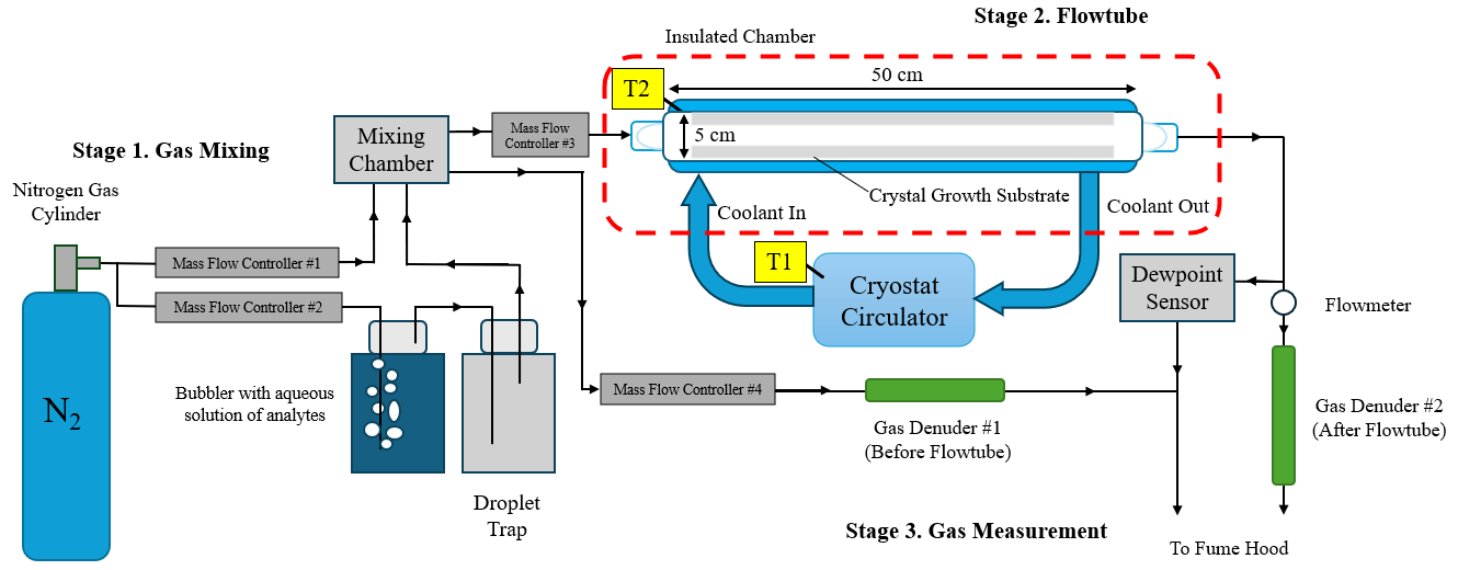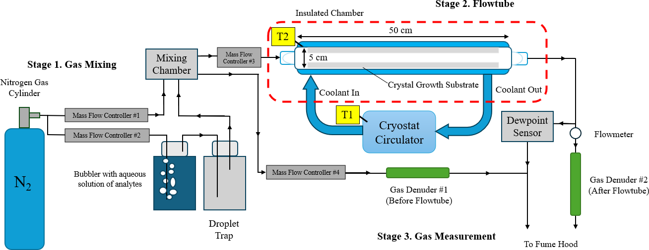 Three uptake experiments were performed with three replicates at atmospheric pressure with the experimental apparatus shown in Fig. 1. The setup had three main stages: an ambient temperature gas-mixing stage, a chilled crystal growth flowtube, and outflowing gas measurement. In the first stage (Stage 1. Gas Mixing), pressurized dry nitrogen gas was passed through a bubbler with known concentrations of the analytes in aqueous solution. This stream of gas then reached saturation at ambient temperature (maintained at 23 °C and confirmed by measurment) and passed through a glass frit and a droplet catching chamber to ensure no liquid droplets remained in the gas stream. The saturated gas stream was then diluted with dry nitrogen to reach the desired humidity and vapor concentration. The specific saturation and vapor concentration mix was maintained using a Mass Flow Controller (Brooks Instrument B.V. 5850TR/FA1B201). The resulting mixed gas was allowed to homogenize inside a 0.5 L mixing chamber and then was introduced into the insulated chamber with the crystal growth tube. Another Mass Flow Controller was used to ensure a constant volumetric flowrate was maintained through the flowtube and through a branching line for input gas measurement.